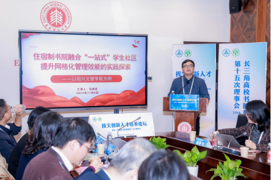 论坛期间,我校学生工作部副部长马海忠以《住宿制书院融合“一站式”学生社区提升网格化管理效能的实践探索——以绍兴文理学院为例》为题作主题报告和交流分享,向长三角地区高校同仁系统介绍了我校立足住宿制书院推进“一站式”学生社区建设的实践措施与探索成果。