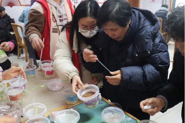 第三期志愿活动,走出校园,走进社区,开展“春植添绿,情暖夕阳”陪伴活动,为老人们送上暖心关怀。活动现场暖意融融,志愿者们提前准备了含羞草、牵牛花、波斯菊等多种花卉种子与种植工具,耐心为老人们讲解种植步骤与养护知识。从装土、撒种到覆土、浇水,志愿者们耐心协助老人操作,细心叮嘱日常养护要点。