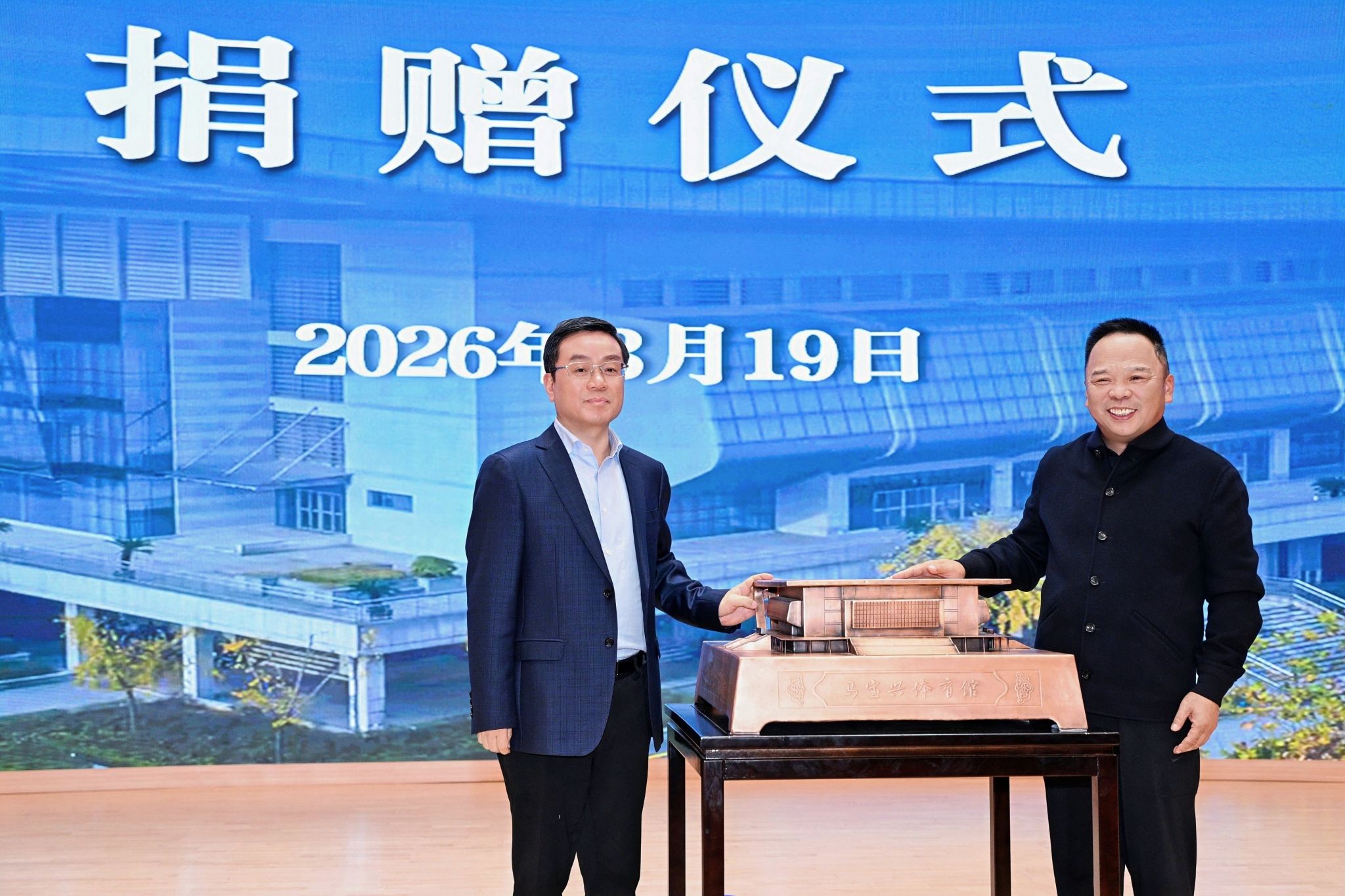 为感谢马建荣先生无偿捐资、情系教育的大爱善举,大力弘扬捐资兴学、造福桑梓的崇高精神,学校决定将河西体育馆冠名为“马宝兴体育馆”——马宝兴先生为马建荣先生的父亲。施惠芳向马建荣先生赠送“马宝兴体育馆”铜雕模型。