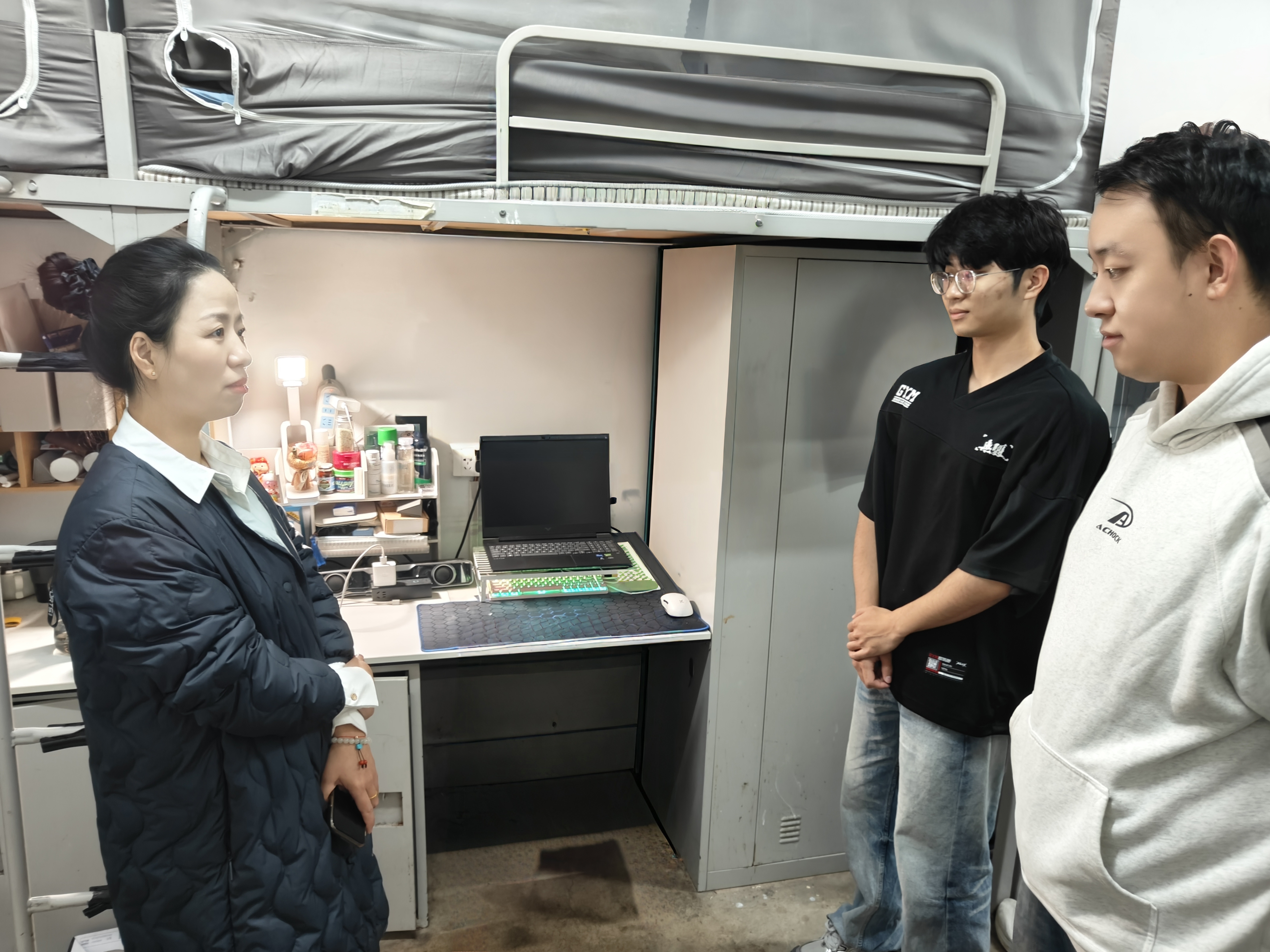 活动以“安全第一、关怀至上”为原则,辅导员们深入各学生宿舍,先细致检查消防安全设施完好度与用电规范,及时提醒学生杜绝违规电器,从源头消除安全隐患。辅导员与学生围坐交流,既关切询问学业进度、生活需求及心理状态,也主动引导学生分享宿舍生活趣事与人际交往困惑,针对学生提出的听课难题、作息协调等实际问题,结合经验逐一给出具体建议。