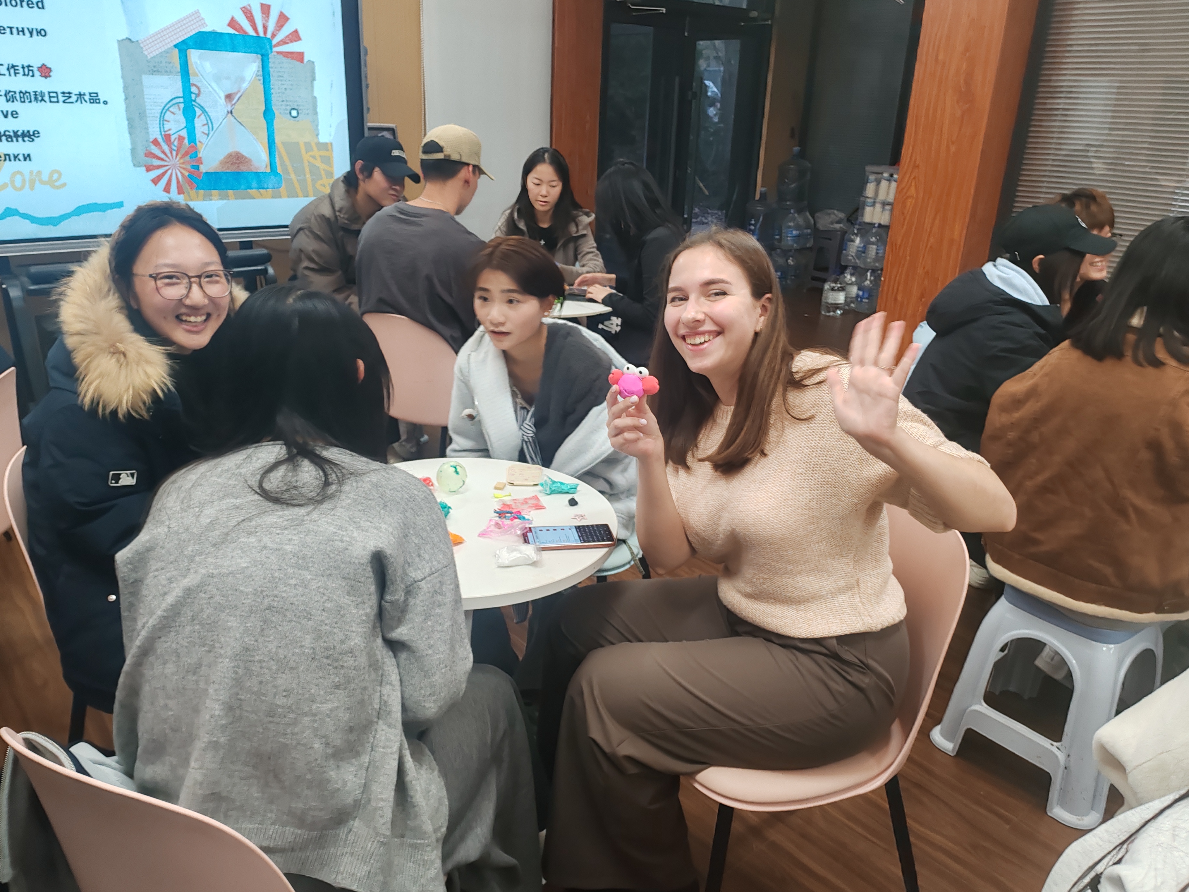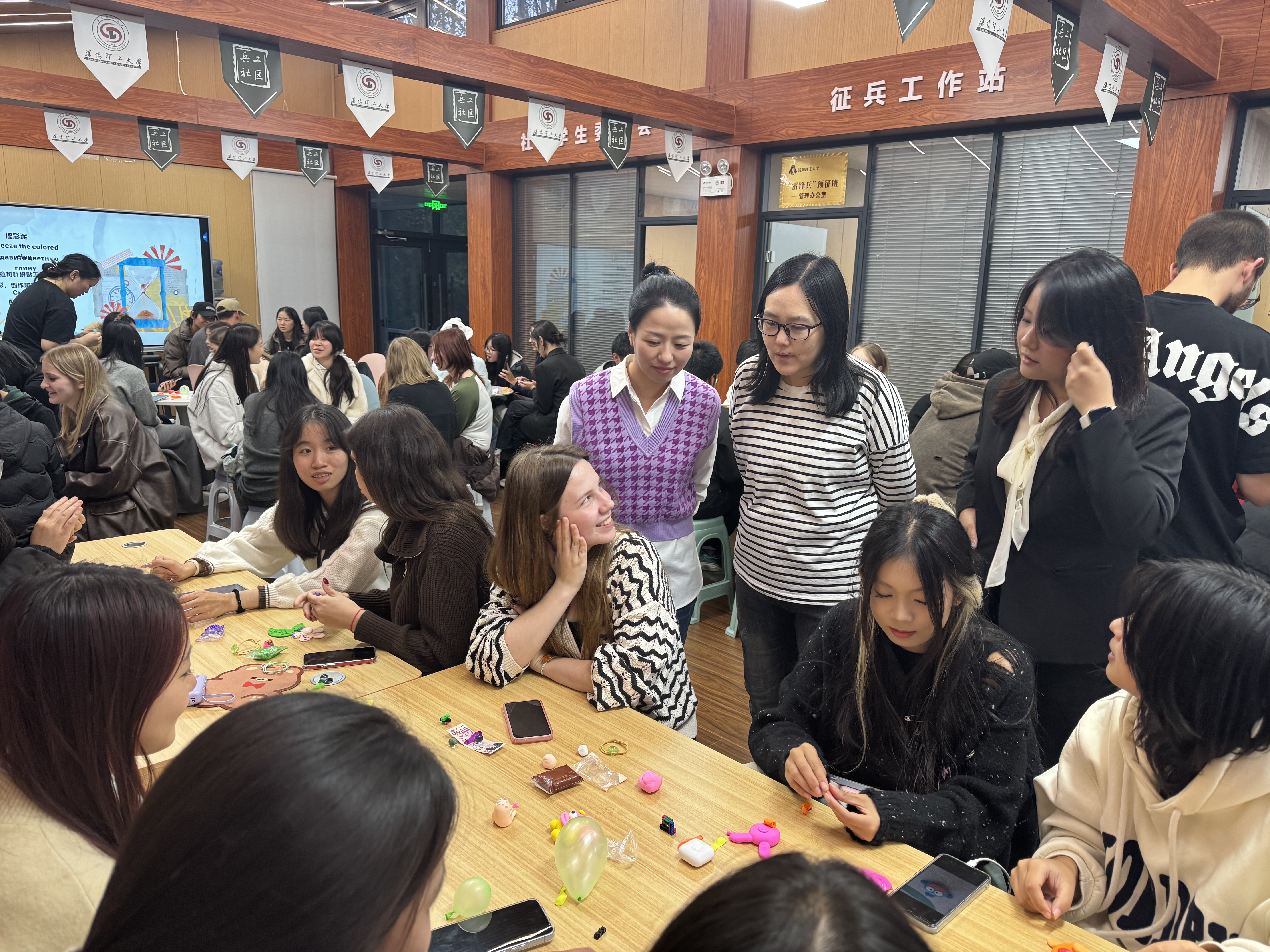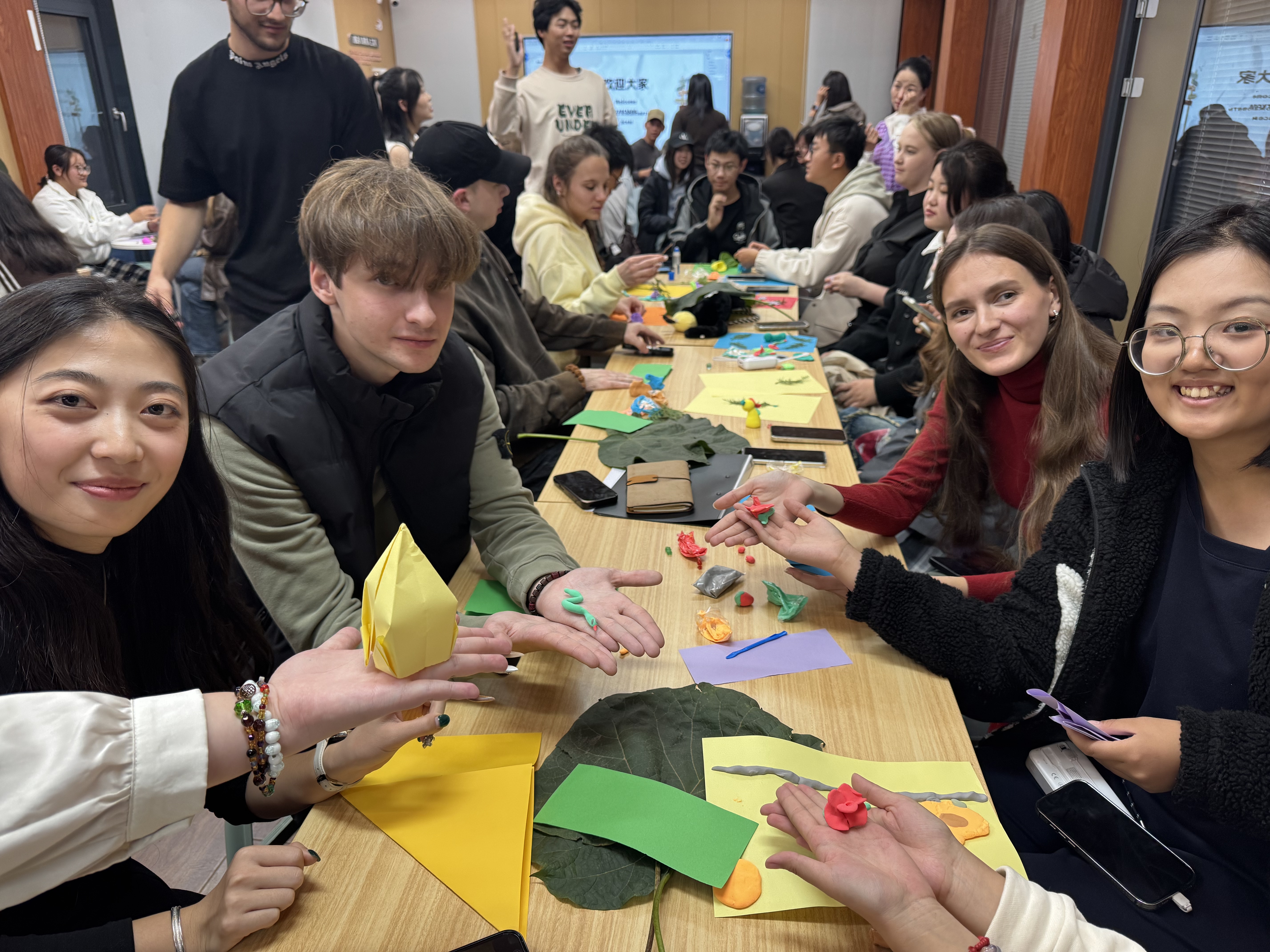 交流会上,多场特色互动活动接连开展。“家乡分享圈”拉近同学彼此距离,同学们多语自我介绍、分享文化故事,展现中、英、俄语言与文化魅力。互动游戏中,留学生在中文提示下完成动作,中国学生用外语鼓劲,同学们打破语言壁垒,在互动中培养默契与信任,减少跨文化沟通的心理障碍。“心灵树洞书信交换” 环节,大家用双语写下学习困惑与成长感悟,随机互换信件并现场交流解惑,现场笑声与掌声不断。捏彩泥与树叶拼贴工作坊上,大家通过手作秋日艺术品释放压力、表达自我,在共创中直观感受文化碰撞带来的心理愉悦与归属感。