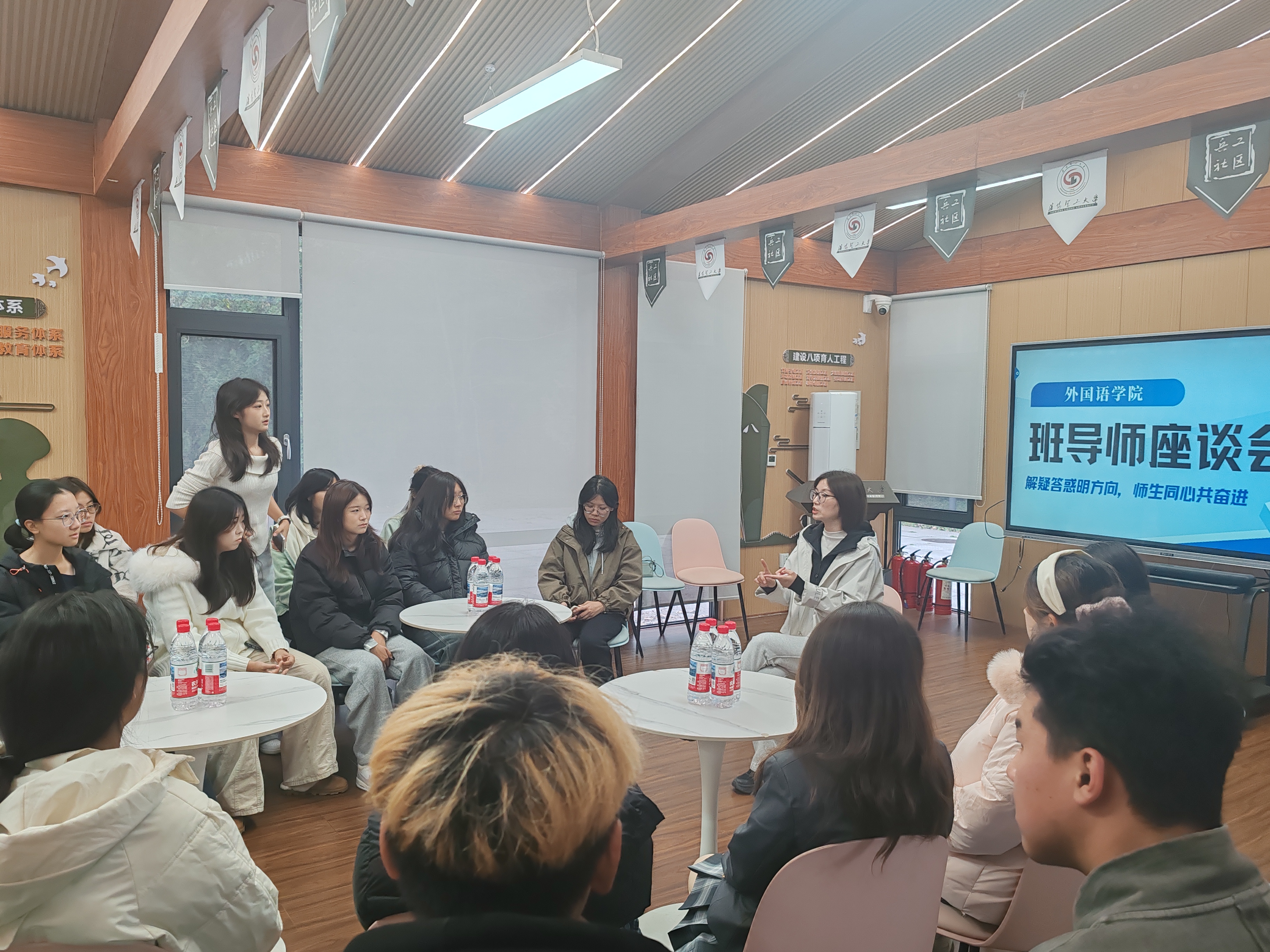活动中班导师与学生围坐交流,针对学业规划、专业发展、校园生活等方面的困惑展开深入探讨。现场学生积极提问,班导师结合自身经验,从外语学习方法、职业发展路径等角度逐一解答。导师详细介绍了翻译、外贸、教育等领域的发展前景与能力要求。交流过程中,师生思维碰撞,氛围热烈融洽。此次座谈会不仅为学生解决了成长中的疑惑,更拉近了师生距离,为学院人才培养与学风建设增添了新的活力。
