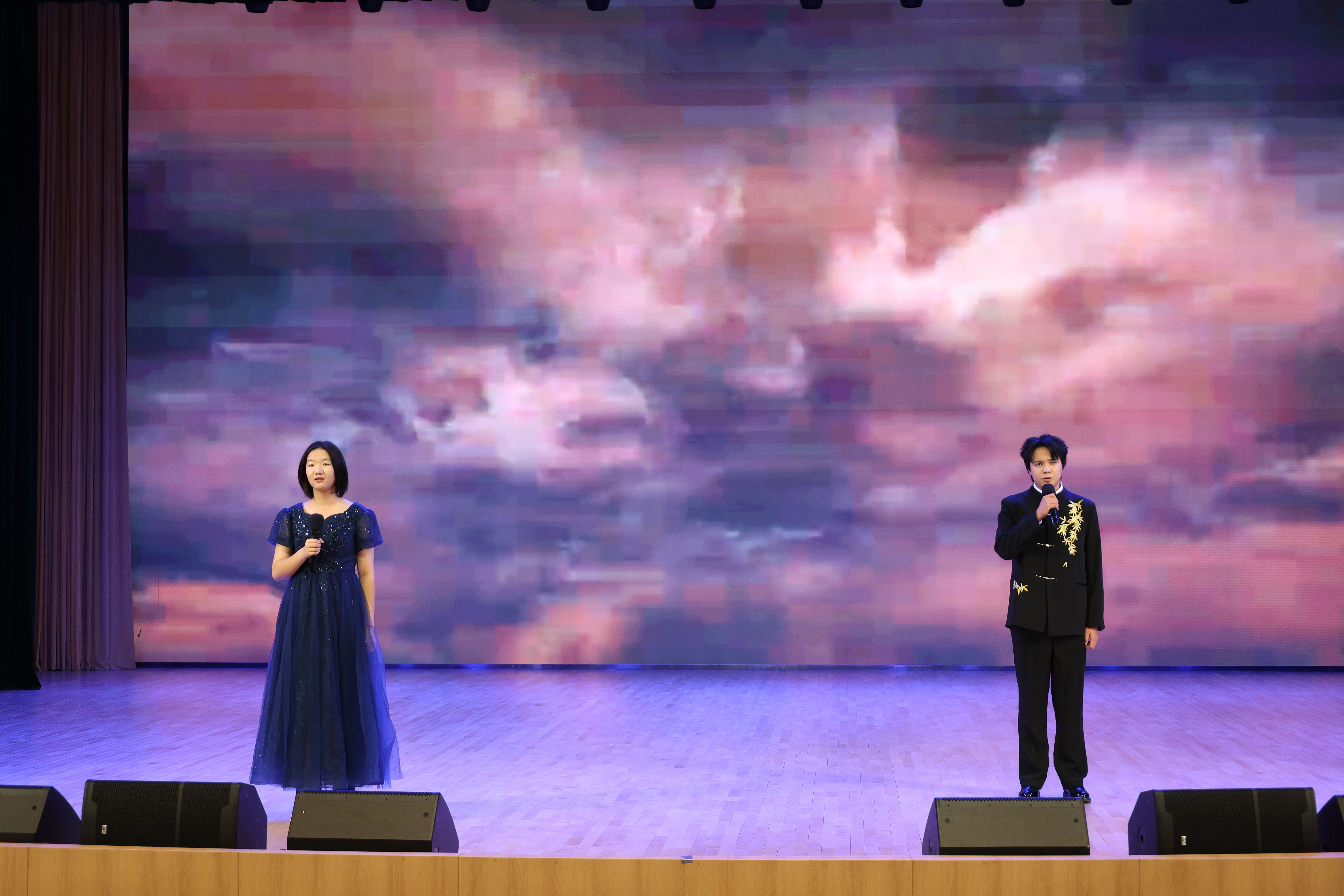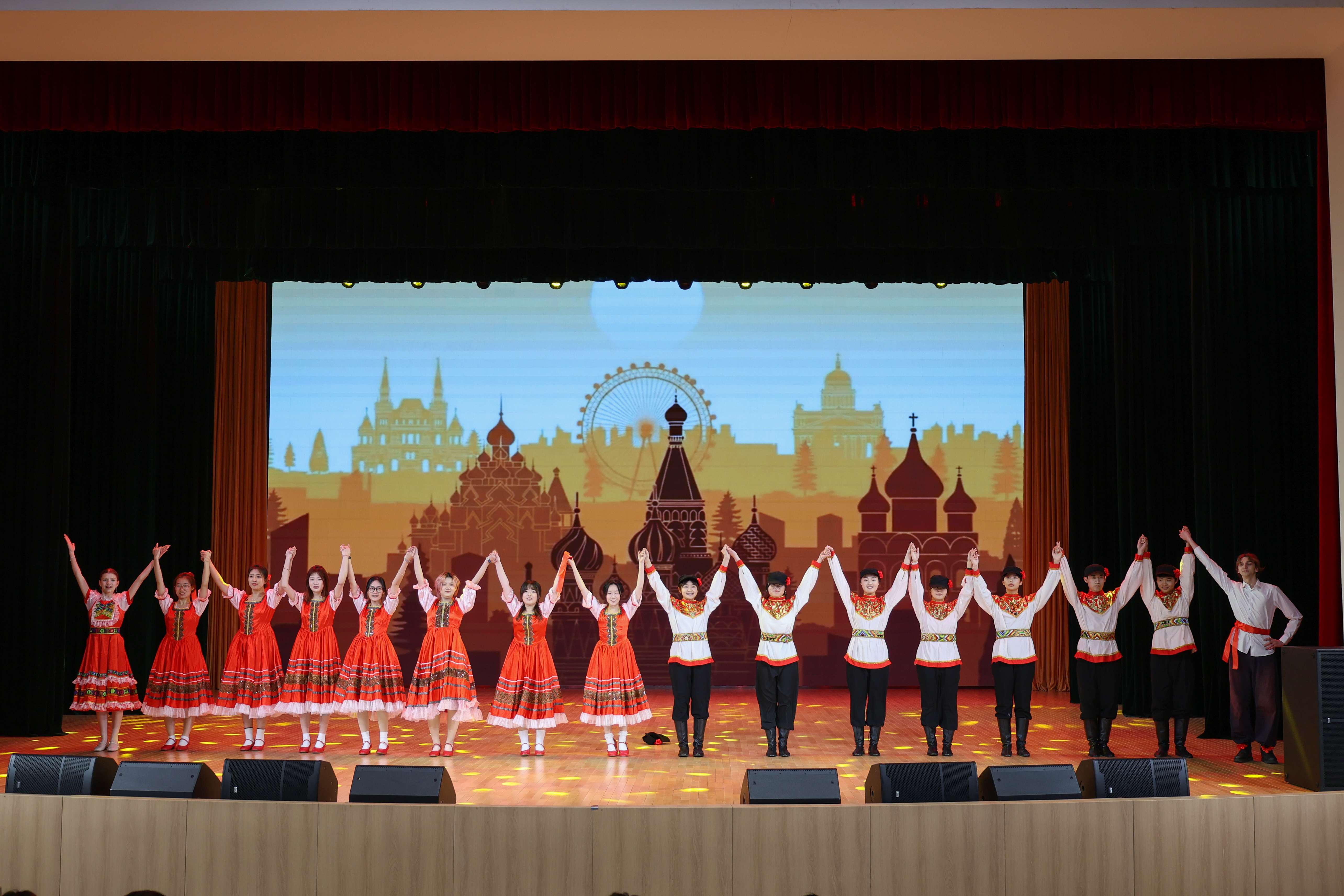 文艺展演环节精彩纷呈,为现场观众带来了一场兼具语言魅力与艺术感染力的视听盛宴。激昂澎湃的俄文朗诵《钢铁》,以铿锵有力的语调传递出跨越国界的精神力量,展现了学子们扎实的俄语语音功底与语言表达能力;灵动轻快的俄式风情舞蹈,将俄罗斯文化的热情与活力展现得淋漓尽致,让在场观众直观感受异域文化的独特韵味;《仰望星空》《目不转睛》《天后》《晚安》等歌曲轮番上演,学子们以俄语或双语演绎,或温柔抒情或热血激昂,在旋律与语言的交融中尽显青春风采;尤为值得一提的是,中俄师生携手唱响《Колыбельнаямедведицы》与《Улыбка》,不同语言的碰撞、不同文化的交融,不仅展现了双方深厚的师生情谊,更成为中俄文化友好交流的生动注脚;舞蹈《HotandCold》以动感十足的节奏点燃全场气氛,将活动推向高潮。整场展演形式丰富多样、内容饱满鲜活,既充分彰显了学子们过硬的俄语综合运用能力,也展现了他们多元的艺术素养与开放包容的跨文化视野。