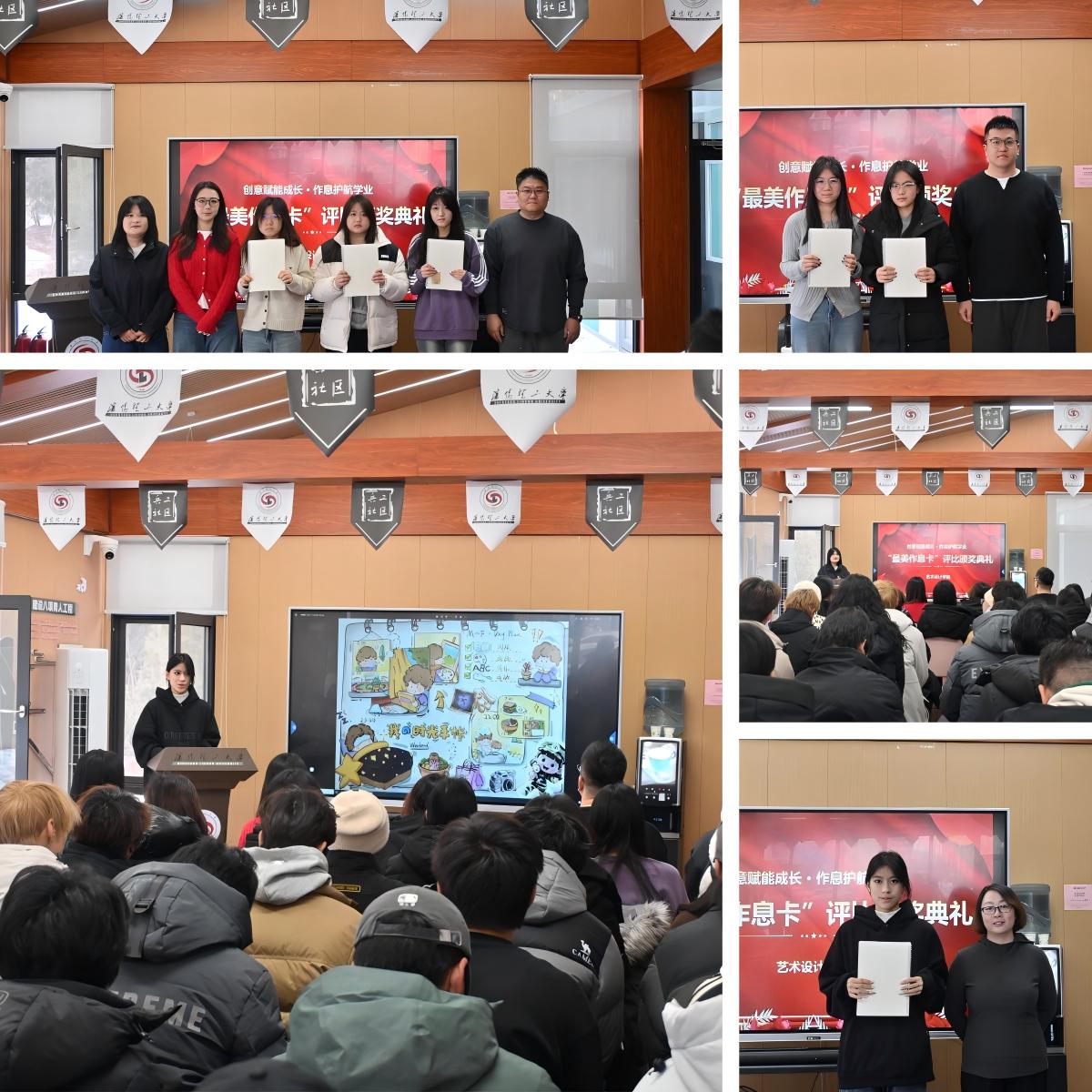 一张张融合艺术创意与实用规划的作息卡依次呈现,从手绘插画的时光手账到简约清晰的周计划表,从专业软件练习的时段规划到晨读复盘的闭环设计,每一份作品都充分展现了学生出色的创新思维与自律意识。展示过后,学院党委副书记李妍以及各年级辅导员老师为蒋夙環等6名获奖学生颁发奖品,并对他们独特的创作理念给予了高度肯定,同时期待他们积极发挥榜样引领作用,带动身边同学养成规律的作息与良好的学习习惯。