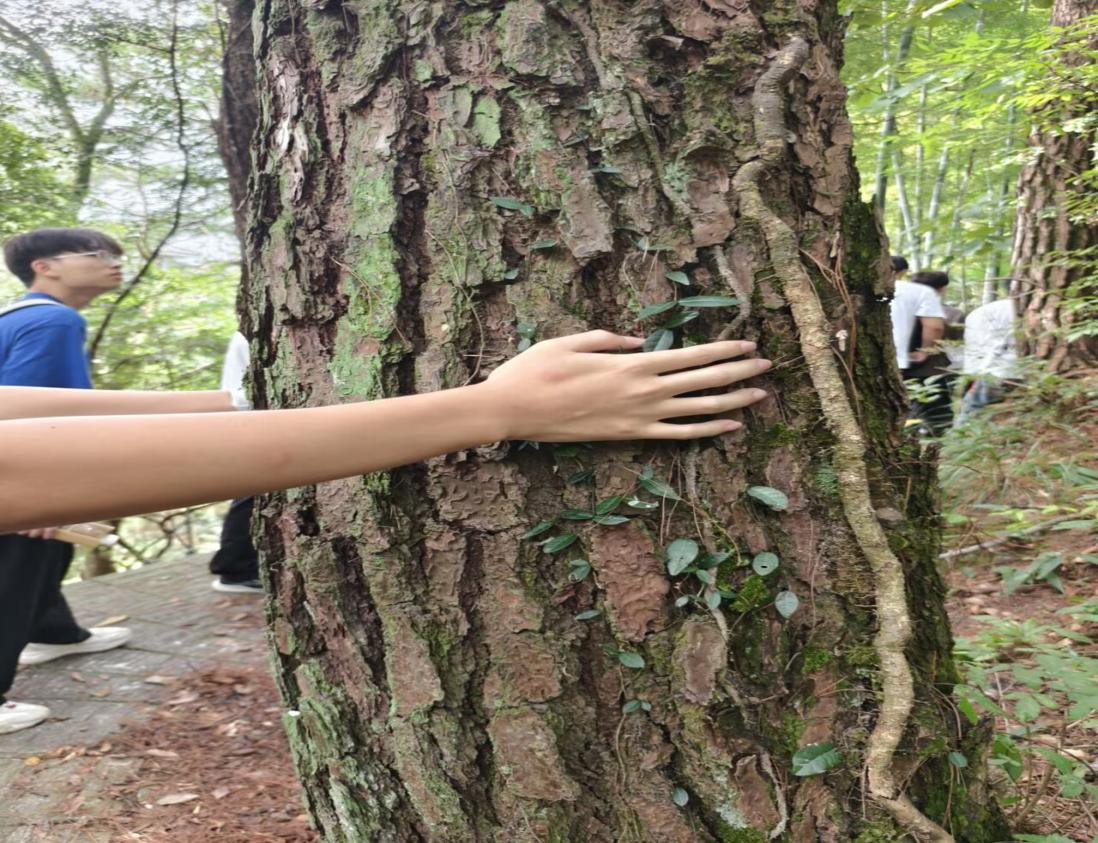 活动没有冗长的讲座,只有有趣的体验。大家闭上双眼,聆听鸟鸣、风声与树叶的簌簌声响,触摸树皮的纹理,轻嗅草木的清香,通过调动听觉、触觉、嗅觉等多重感官,逐步卸下日常学习生活的疲惫,快速融入自然环境。