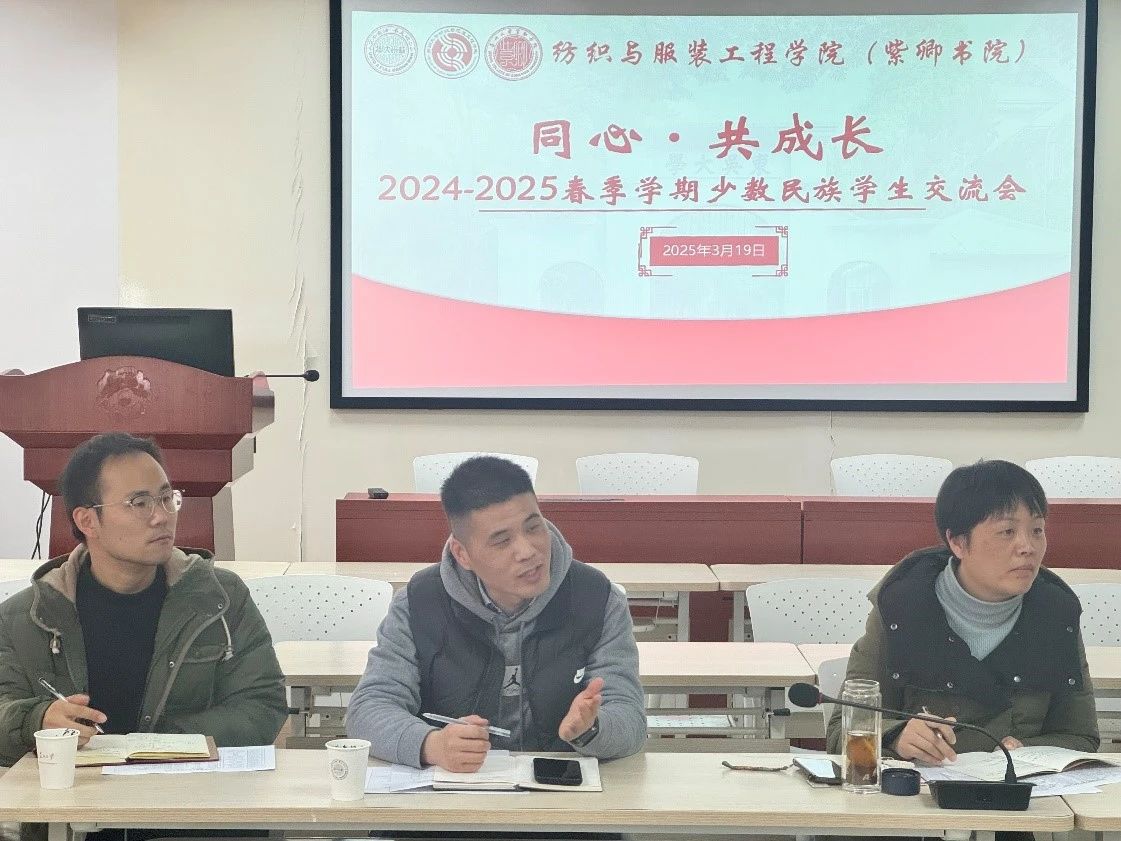 3月19日下午,纺织与服装学院(紫卿书院)“同心·共成长”2024-2025春季学期少数民族学生交流会在工科楼后座619会议室举行。学生工作部(处)副部(处)长黎春虹,纺织与服装工程学院党委副书记、副院长虞岚,党委保卫部(保卫处)政治保卫科科长石峰、孙金强,“红石榴”辅导员工作室买合苏旦、文璐,优秀学生代表祖拉兰及全体新疆籍少数民族学生齐聚一堂,围绕铸牢中华民族共同体意识主线,聚焦学生成长需求,共话生涯规划蓝图。交流会由学院学生工作办公室主任季彦斐主持。