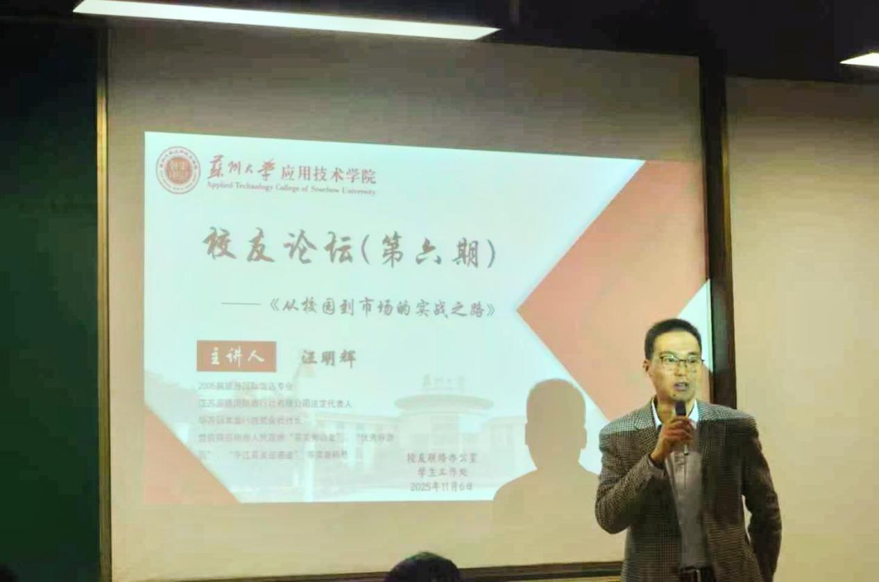 为深化创新创业教育,促进校友与在校师生交流,11月6日,由学生工作处、校友联络办公室与创新创业中心联合主办了第六期校友论坛暨创业沙龙。本次活动特邀2005届旅游管理专业校友、江苏运通国际旅行社有限公司法定代表人、华苏日本旅行株式会社社长汪明辉担任主讲嘉宾。