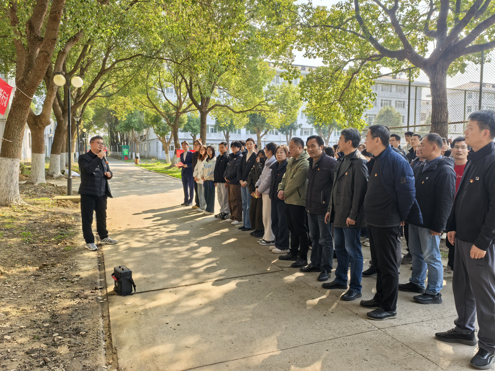 为保障植树科学规范,后勤与资产处徐卫斌老师现场进行种植技术讲解与示范,细致指导挥锹培土、扶正树苗等操作要点。