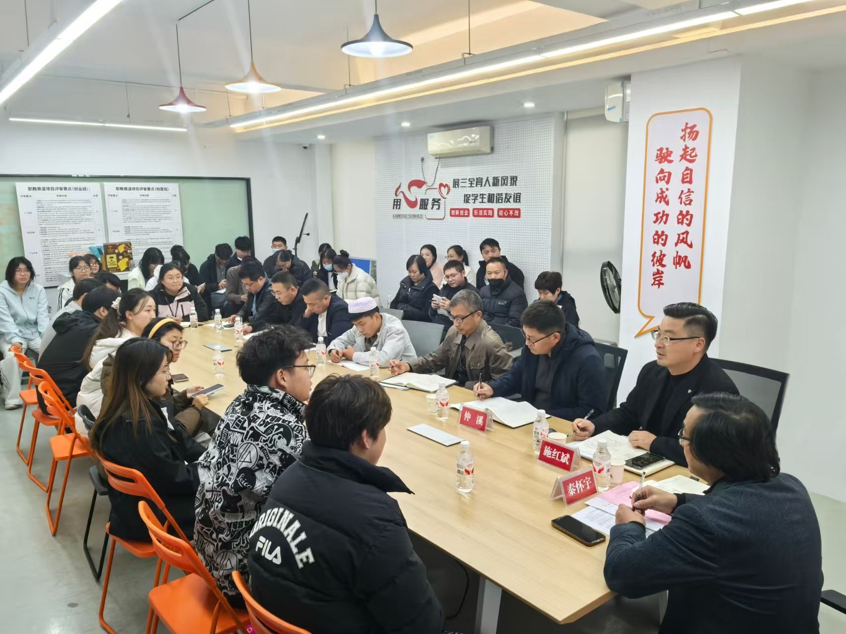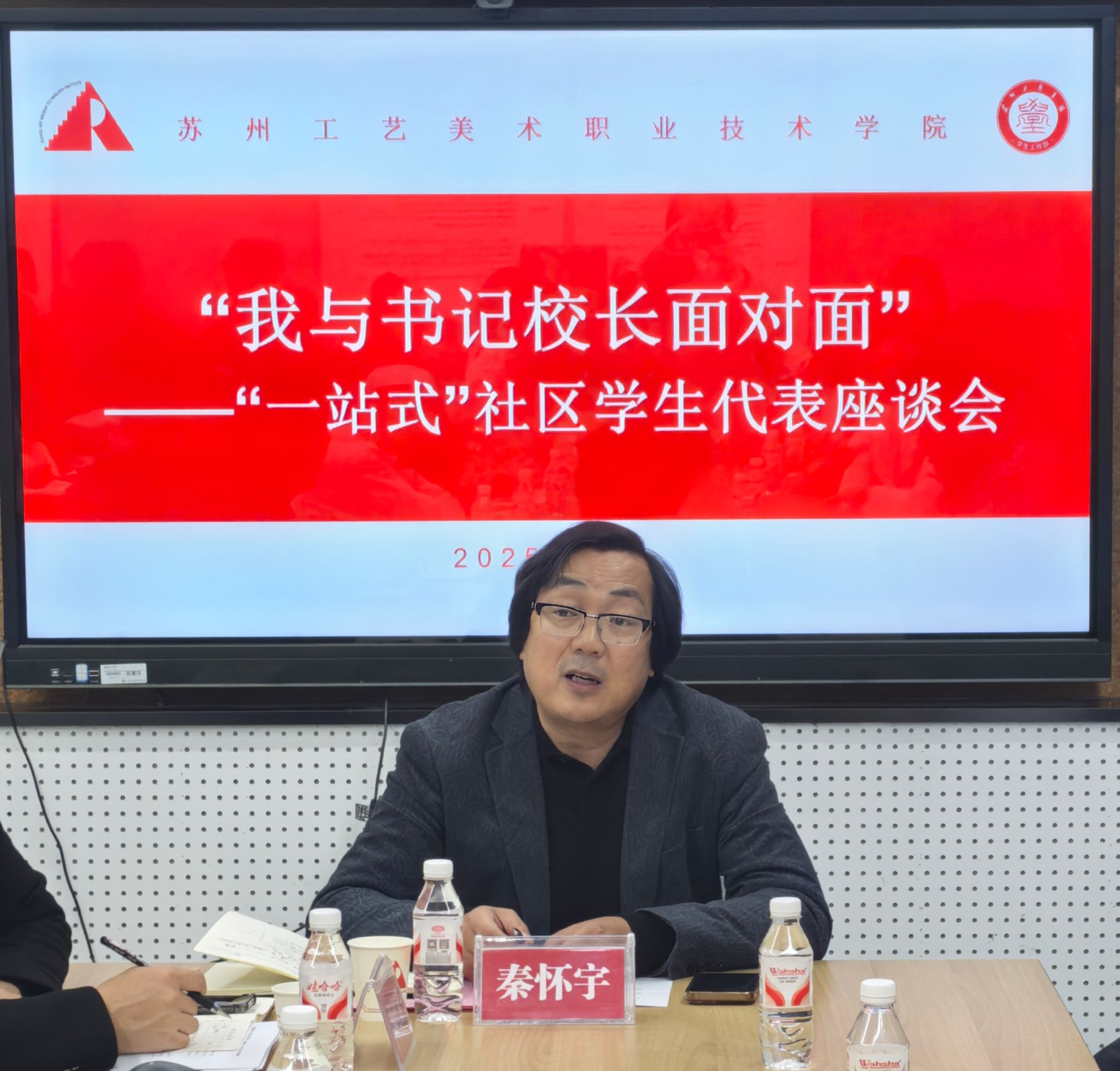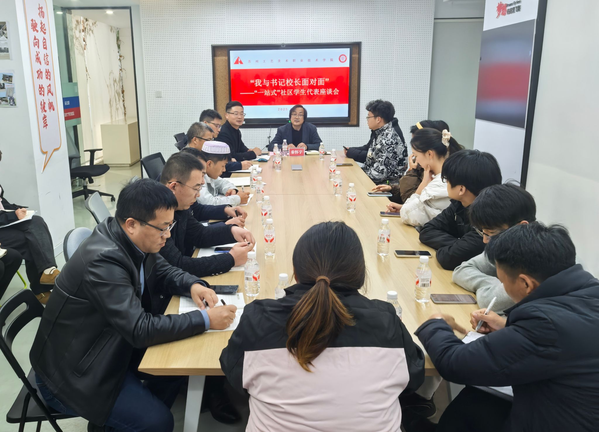 为进一步促进管理工作人性化,提高学校管理工作的民主化水平,聚焦学校后勤服务中的“急难愁盼”问题,听诉求、解难题、话发展,让师生的“心声”变成 “掌声”。12月1日下午,学校在“一站式”社区中心会议室召开“我与书记校长面对面”学生代表座谈会。副校长秦怀宇,学生工作部、保卫部、后勤管理处相关中心负责人,各二级学院党总支副书记、辅导员,学生工作部全体工作人员和来自七个二级学院不同年级的14名学生代表参加本次座谈会。