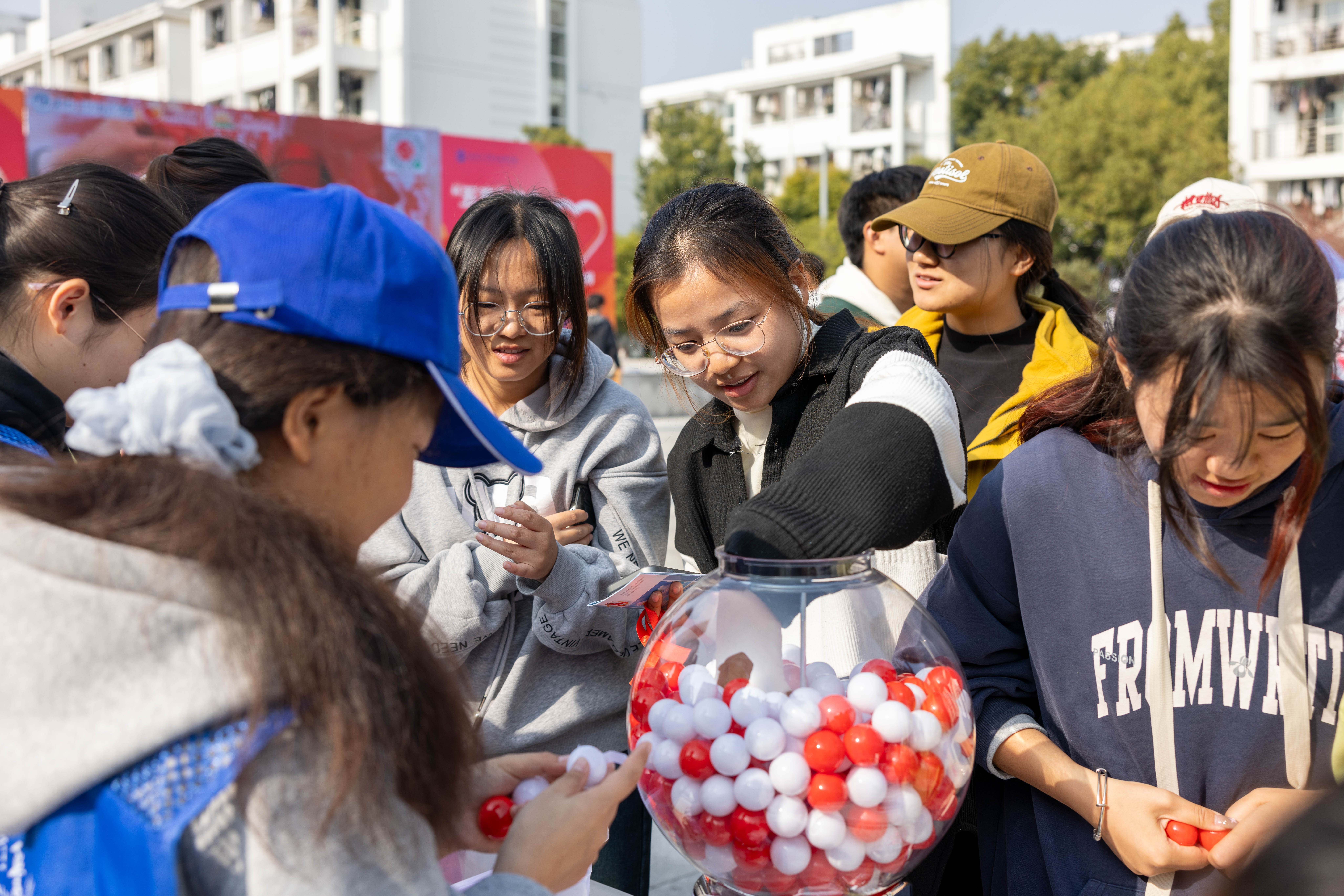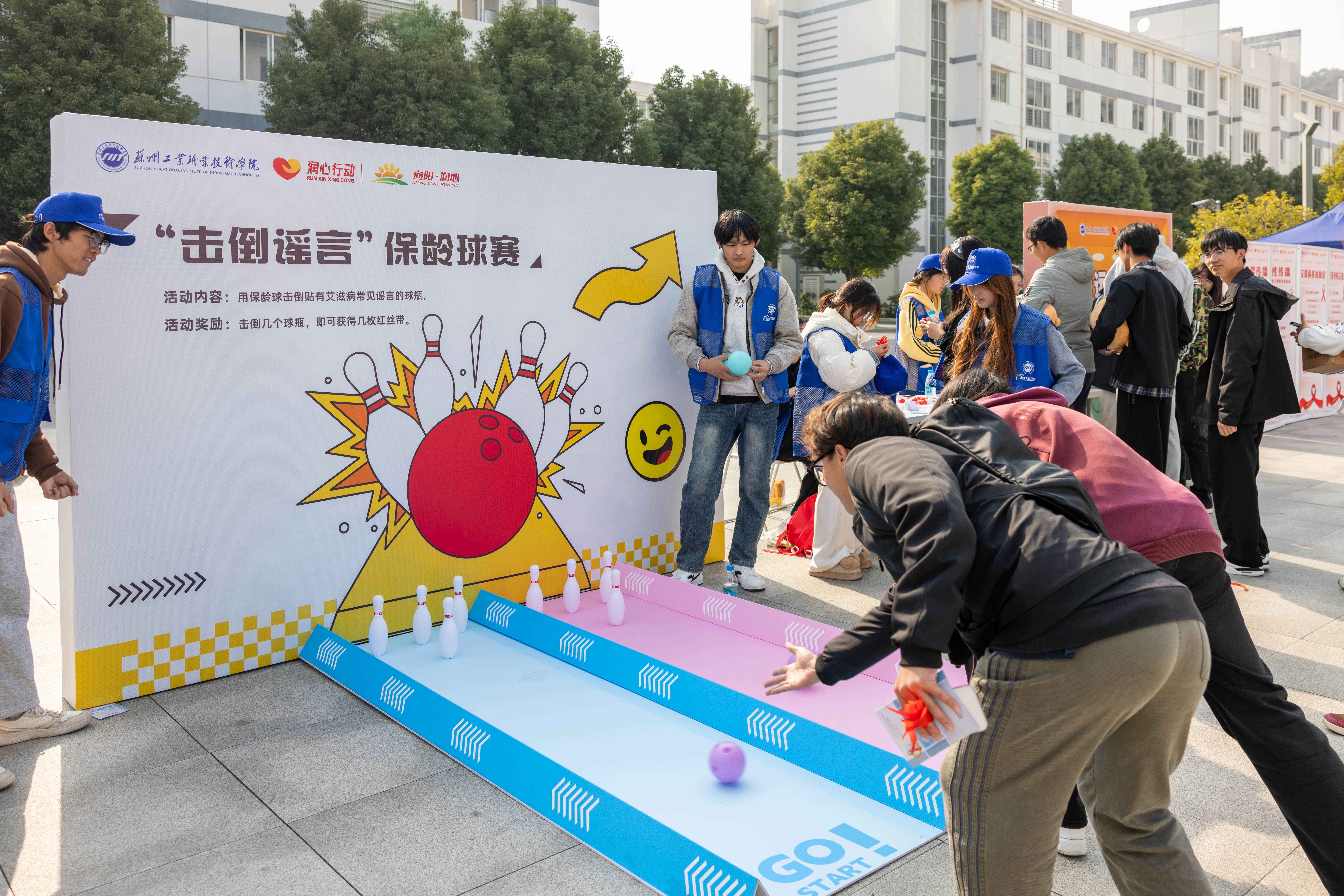 本次活动深入“一站式”学生社区,融合知识普及、互动体验与文化传播于一体,活动现场设有七大互动区,包括“知艾防艾”科普宣传、“让‘艾’飞走”投掷挑战、“击倒谣言”保龄球赛、“艾的宣言”弹幕互动、“让红丝带飘起来”、幸运扭蛋机、掐丝珐琅书签DIY。同学们通过参与各类互动游戏收集“红丝带”,凭红丝带数量可兑换定制抱枕、文具等精美奖品。