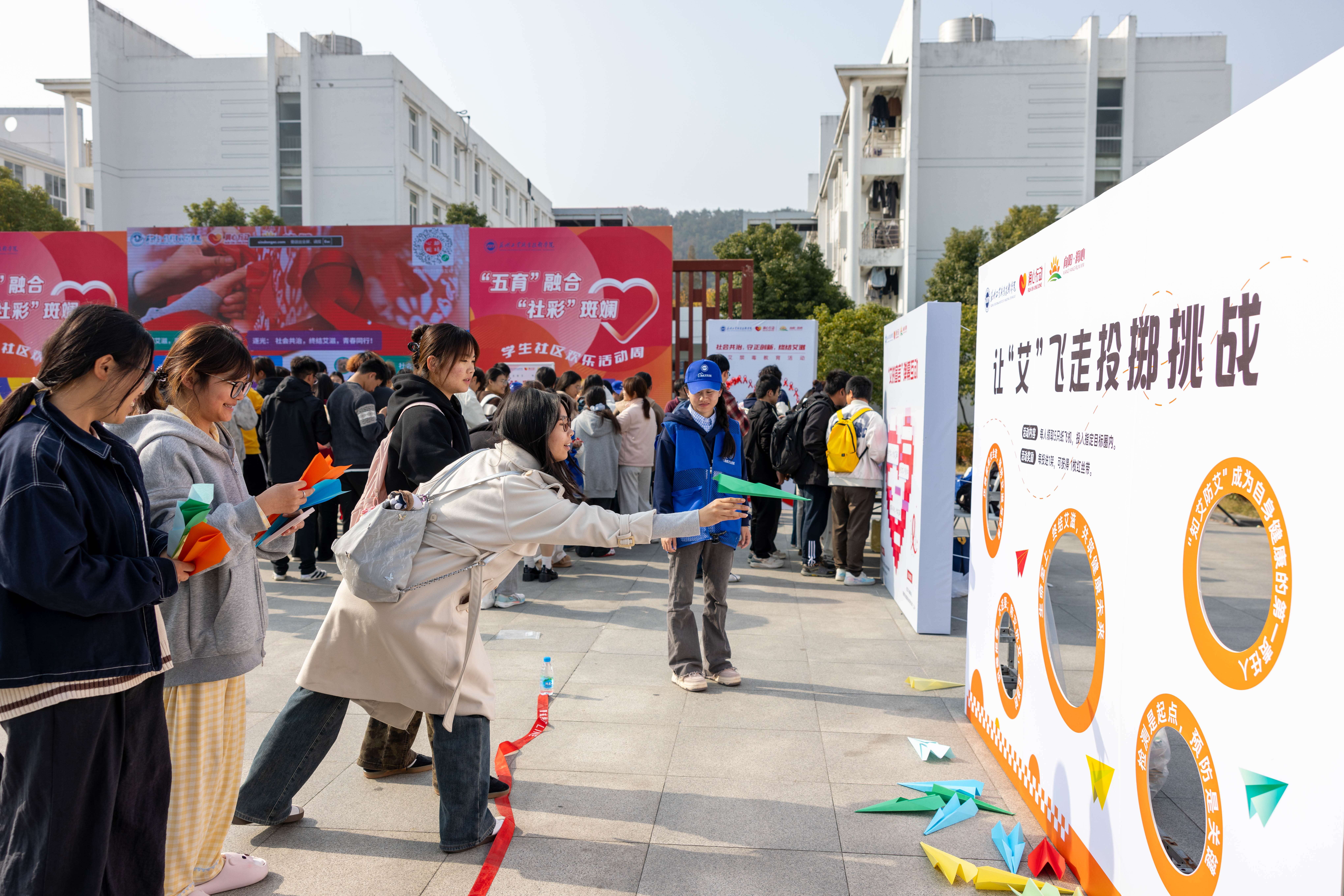 作为第十届全国大学生预防艾滋病知识竞赛的承办单位之一,学校率先启动线上竞赛环节。“知艾防艾”科普宣传区将现场的展板宣传与知识竞赛、幸运扭蛋机结合,有效提升线上线下参与度。“让‘艾’飞走”投掷挑战与“击倒谣言”保龄球赛以纸飞机、保龄球为媒介,让学生在轻松愉快的氛围中破除有关艾滋病常见的知识误区,掌握艾滋病防治的有效方式。“指尖传承,为‘艾’前行”掐丝珐琅书签DIY活动,巧妙融合传统工艺与防艾主题,引导学生在亲手制作红丝带书签的过程中深化健康意识。“让红丝带飘起来”环节以红丝带作为整场活动的链接纽带,同学们在兑换奖品后,主动将收集到的红丝带粘贴于背景墙,最终汇聚成一面“红丝带爱心墙”,生动诠释了全校学子同心抗艾的坚定信念与团结力量。