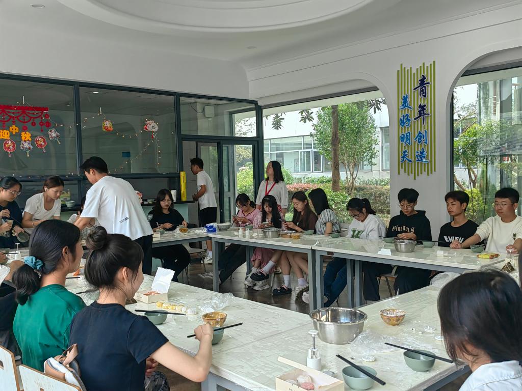 “自己做的月饼就是好啊!这是我第一次学做月饼,刚开始有点笨手笨脚,但我体会到了自己动手的快乐!”来自山西的徐凡珺同学拿着自制的月饼高兴地说。活动现场,每个同学的面前摆着馅料、预拌粉、月饼模具等,同学们戴起手套、揉搓面团和馅料、上模具、压模印,制作自己喜欢的月饼,互相交流着家乡的中秋节习俗,气氛温馨活跃。
