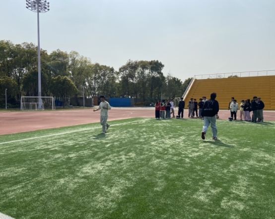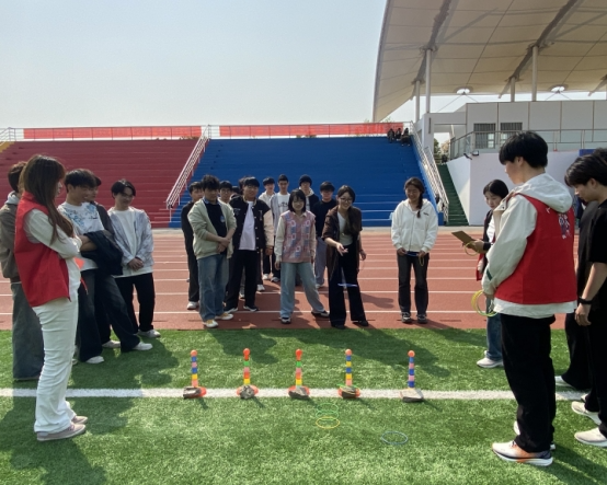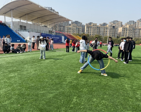 活动现场,同学们全心投入比赛协作。在“南水北调”项目中,大家小心翼翼传递水杯,力求不洒一滴水;“无敌风火轮”的现场,参赛队员们努力保持统一步调,齐心协力赶赴终点;“螃蟹赛跑”和“一圈到底”则充分展现了同学们的灵活性和协调性;最后的“趣味套圈”环节,选手们精准投掷,引来阵阵喝彩,运动会在同学们的欢声笑语中顺利落下帷幕。