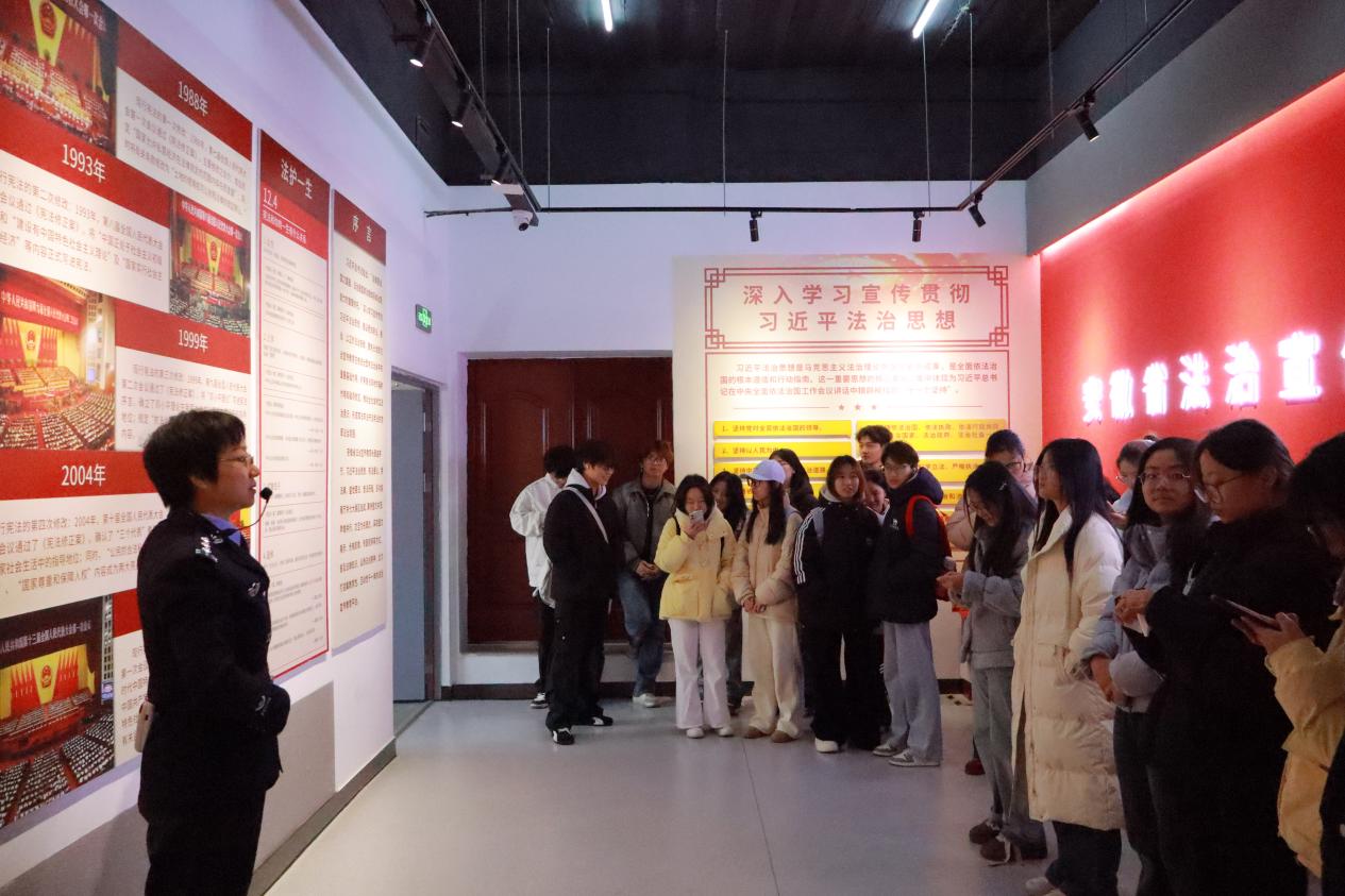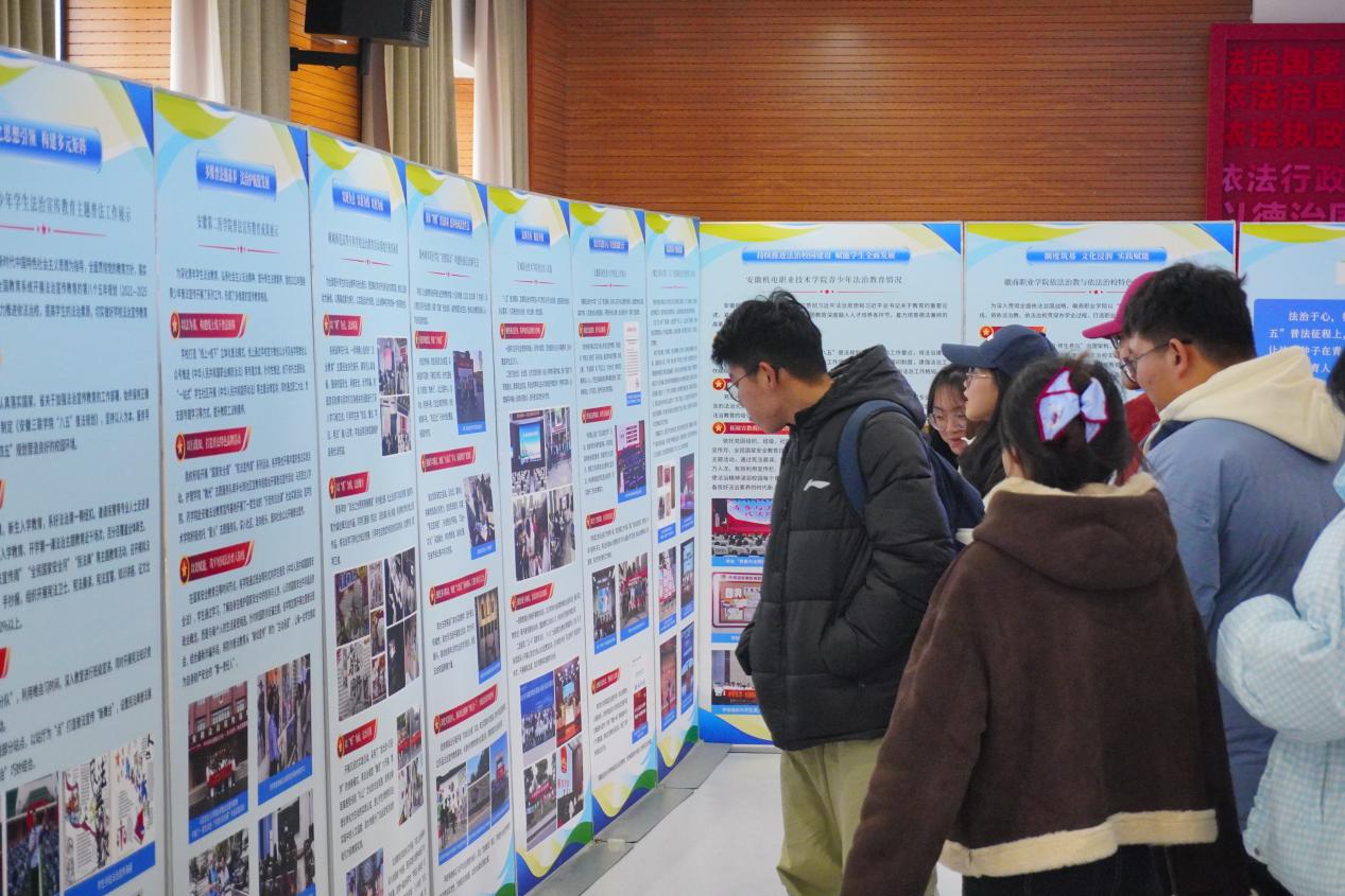上午9时许,队伍抵达首站——安徽省法治宣传教育基地。在专业讲解员的引导下,师生们沿着展区脉络缓缓前行,沉浸式感受法治文化的深厚底蕴。展览以图文展板、实物陈列、互动体验等多元形式,全景式呈现“八五”普法以来全省教育系统法治教育的丰硕成果,将抽象的法律知识转化为可感可知的教育场景。每一处展区都吸引着同学们驻足细看、认真记录。值得欣喜的是,我校的法治教育成果也在展厅中亮相,让同学们倍感自豪,更坚定了尊法学法守法用法的信念。