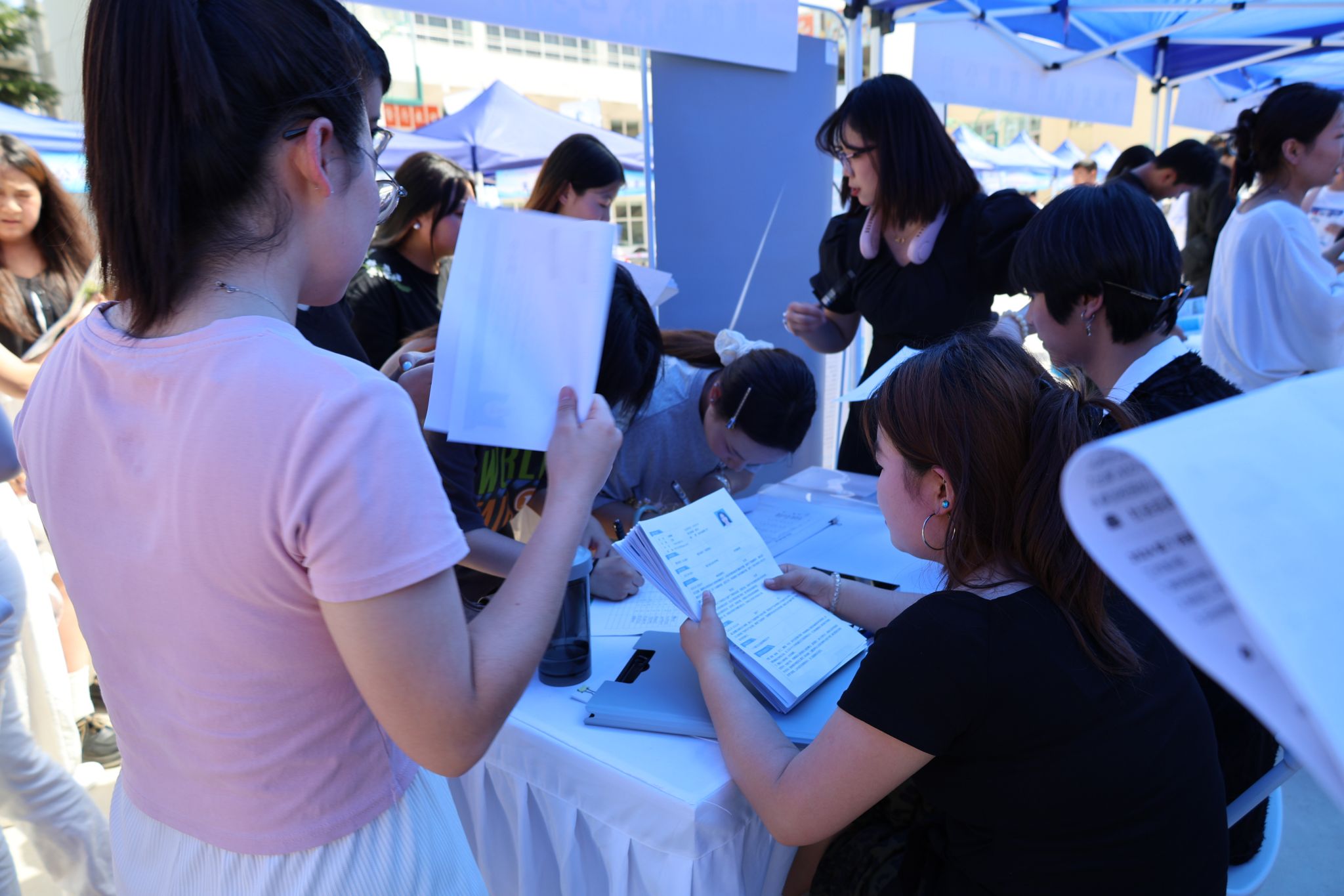 招聘会现场人头攒动,毕业生踊跃提交应聘信息及个人简历,积极向用人单位自荐,并详细和用人单位进行沟通。各用人单位通过易拉宝、海报展示、面对面交流等方式向毕业生介绍企业情况。活动现场,市人才交流中心就“吾”铜引凤、毕业生落户就业、就业创业等政策设立宣传服务专区,向学生详细讲解宣传各项政策。招生就业处、各二级学院安排专人与参会企业一对一沟通,详细了解用人单位的人才需求和对毕业生的评价,精准开展访企拓岗。
