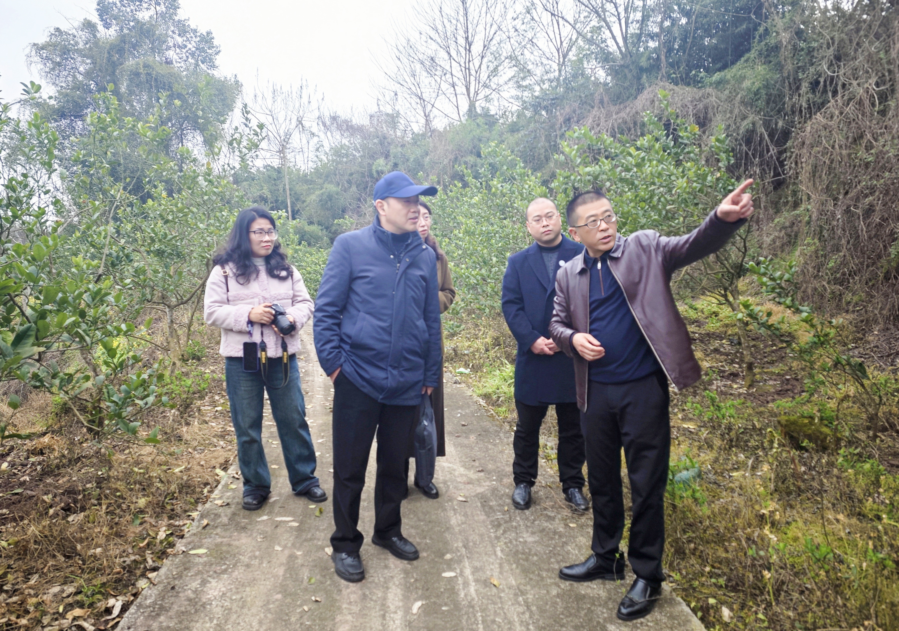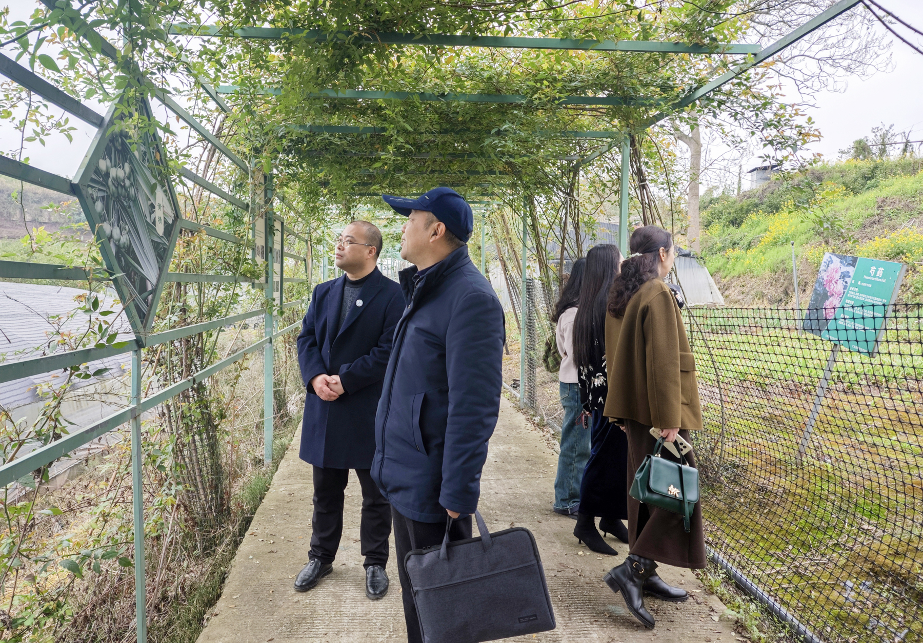 在仁寿县科协主席胡永生、基地总经理赖东妹(眉山市人大代表)陪同下,调研组实地考察了标准化种植示范区。赖东妹总经理详细介绍了基地运营体系,360亩核心种植区规模化培育佛手、白及等十余种道地药材,形成“种植-收购-农技推广”全链条产业模式,年产值过亿的运营成效为教学实践提供了真实案例。