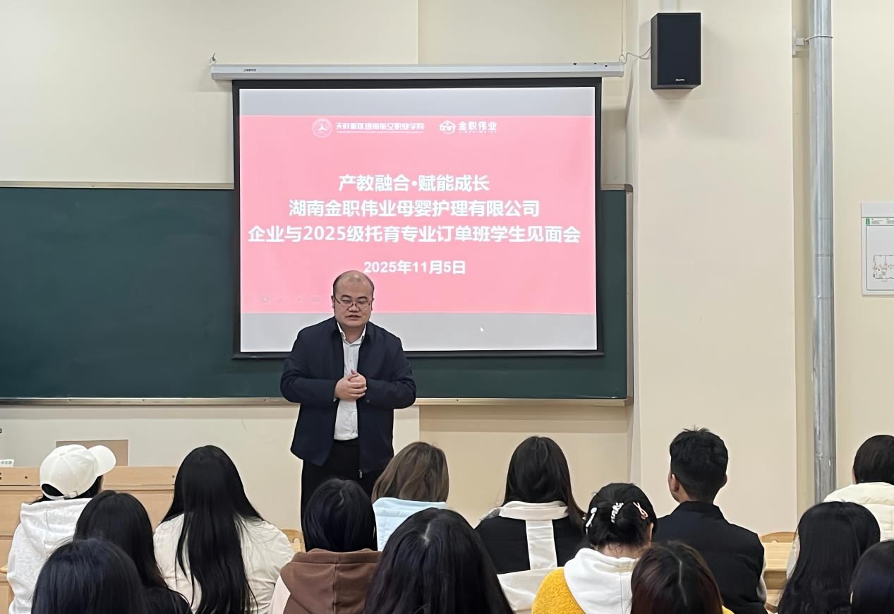 11月5日下午,教育健康管理学院幼儿托育服务与管理专业订单班合作企业——湖南金职伟业母婴护理有限公司一行莅临我校,与订单班学生开展深度交流。企业方代表产业学院副院长刘志杰、金岗就业中心区域负责人易帆,学院院长周林及教育类专业全体任课教师共同参与本次活动。