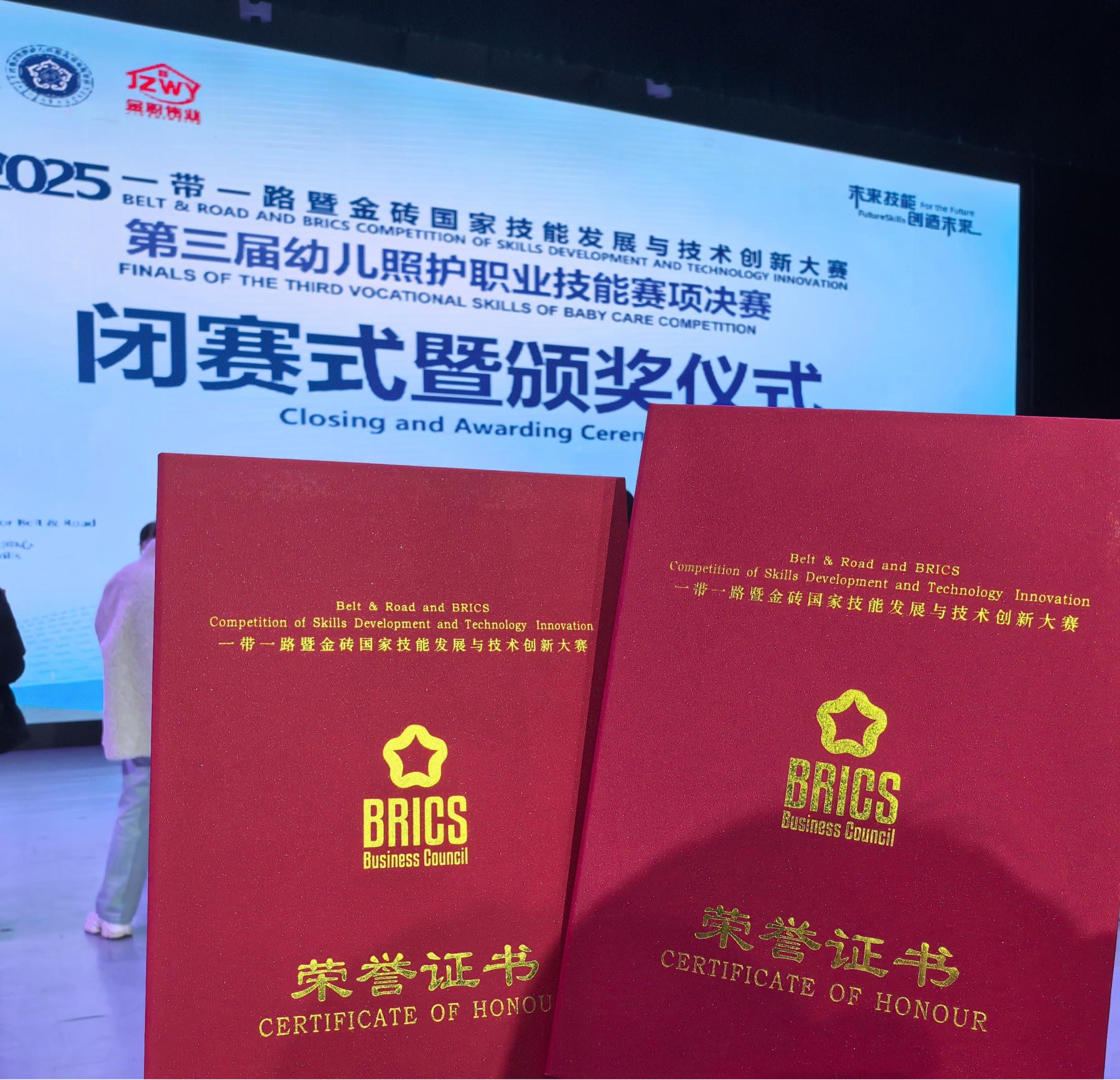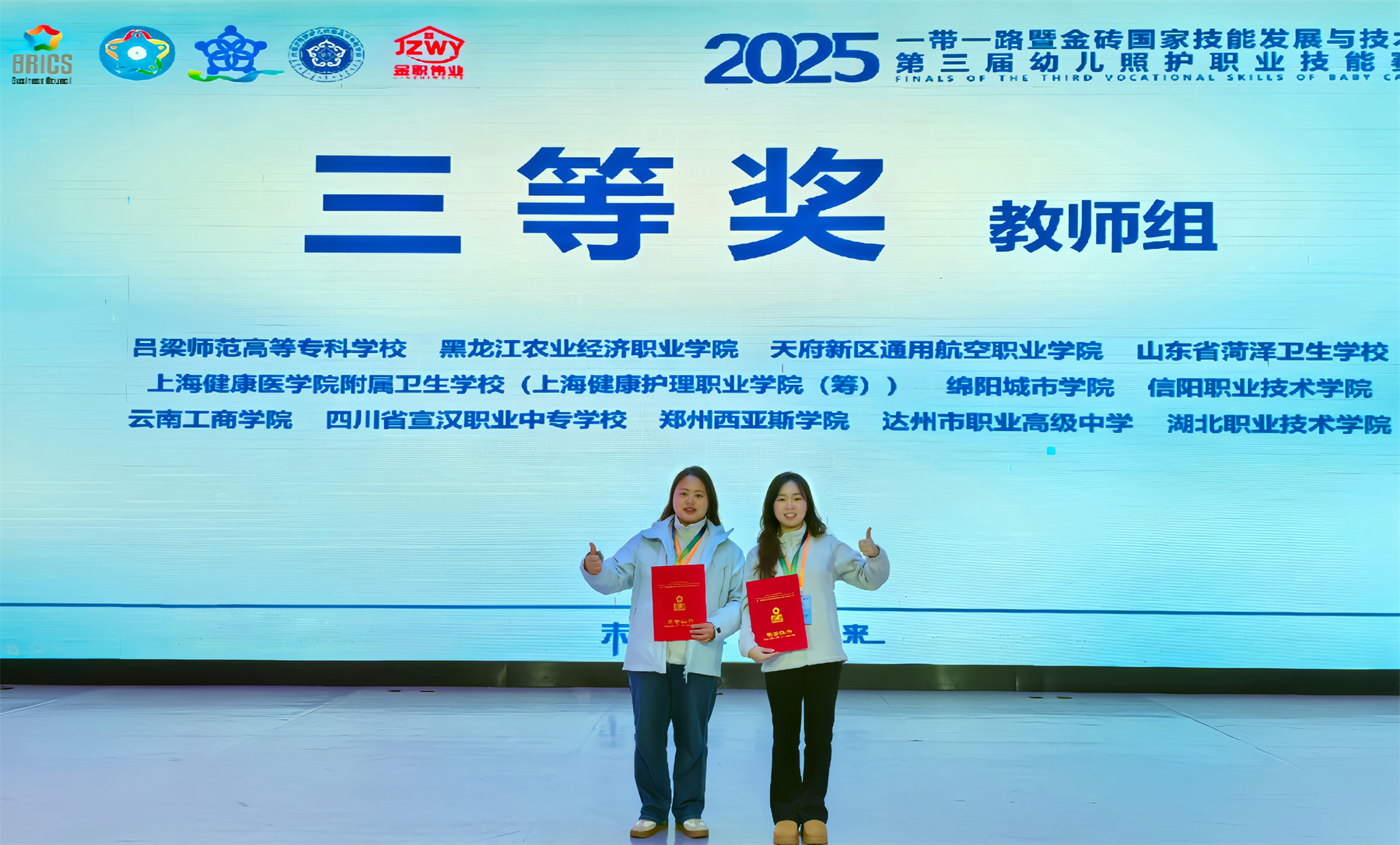 12月9日,2025一带一路暨金砖国家技能发展与技术创新大赛第三届幼儿照护职业技能赛项决赛圆满落幕。教育健康管理学院学龄前教育教研室何明倢、廖海英两位老师凭借扎实的专业功底、娴熟的实操技能脱颖而出,荣获大赛教师组三等奖,充分彰显了学院教学团队的过硬素养与育人实力。