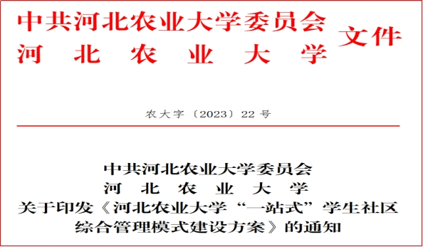自2023年以来学校相继制定出台了《河北农业大学“一站式”学生社区综合管理模式建设方案》《河北农业大学“一站式”学生社区综合管理模式建设重点任务清单》《河北农业大学“一站式”学生社区党员工作站实施方案(试行)》《关于一站式学生社区党员工作站建设相关要求》等系列配套政策,以上相关政策是建设一站式学生社区指导纲领和行动指南,确保了“一站式”学生社区综合管理模式建设的发展方向。