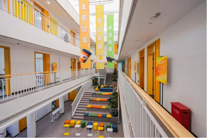 中心大厅明净敞亮,走廊布局井井有条,彩色竖幅点缀空间活力