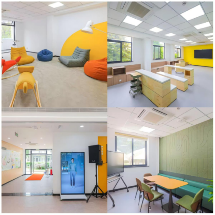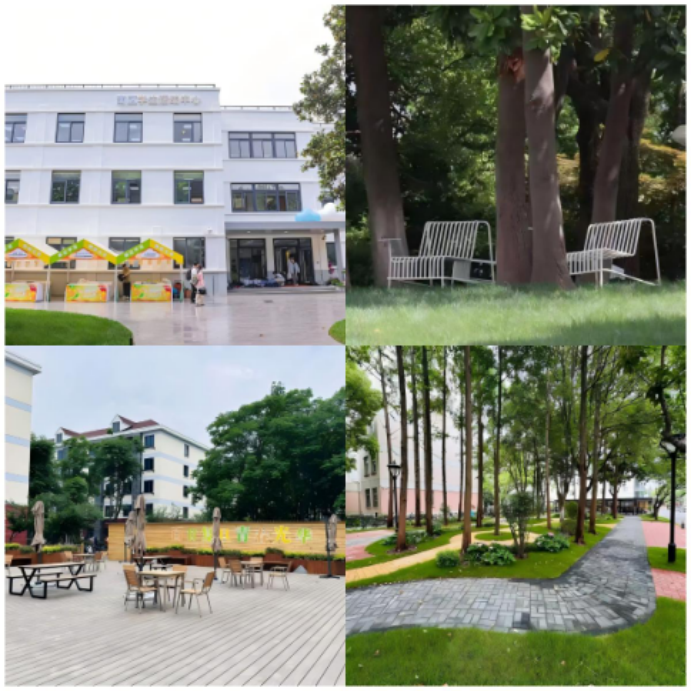 兼顾生活场景。中心南侧室外广场设置社交休闲座椅,原老旧车棚升级改造为绿意停车区,有效疏解园区非机动车停放问题。北侧楼外修建口袋公园,木质桌椅与遮阳篷布打造休闲氛围,以自然之美点亮学习生活日常,打造学生无屏幕社交“轻场域”。
