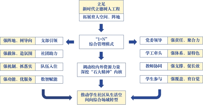 学校立足“十大育人工程”建设基础,不断拓展育人空间和阵地,构建“一站式”学生社区“1+N”的综合管理模式,以“党委领导”强责任、聚合力,以“学工牵头”强体系、显特色,以“教师协同”强支撑、促长效,以“学生参与”强覆盖、育自觉,以“支部引领”强阵地、树导向,以“社团助力”强载体、造氛围,以“队伍入驻”强机制、抓落实,以“数智赋能”强功能、优服务,充分调动校内外资源力量,深入挖掘“石大精神”内核,广泛开展思想引领、心理团辅、创新创业、文体发展等育人活动,推动学生社区从生活空间向思想教育、管理服务、创新实践、文化育人的综合场域转型,用一流学生社区建设助力一流人才培养、服务一流大学建设。