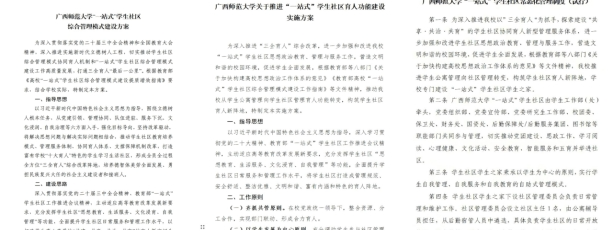 一是强化顶层设计,健全工作机制保障。学校党委高度重视“一站式”学生社区规划建设,成立由校党委书记、校长任组长的工作领导小组,将“一站式”学生社区建设工作作为常委会和校长办公会重要议题,每学期专题研究,及时协调解决机制构建、资源配置、经费保障等问题,形成党委统一领导、党政齐抓共管、有关单位各司其职、全员协同参与的工作领导体系。学校制定《广西师范大学“一站式”学生社区综合管理模式建设方案》《广西师范大学关于推进“一站式”学生社区育人功能建设实施方案》《广西师范大学“一站式”学生社区常态化管理制度》等配套文件,台账式落实我校“一站式”学生社区综合管理模式建设提质增效任务清单和建设方案的各项工作任务。二是强化监督落实,完善制度执行保障。通过制度建设统筹推进校院两级负责同志带头践行“一线规则”,常态化深入学生社区,建立与学生常态化交流互动机制。将“一站式”学生社区建设工作纳入校级党组织落实全面从严治党主体责任清单,纳入校级党组织书记第一责任人清单和班子其他成员“一岗双责”责任清单,纳入学校党委和行政工作要点。确保学生社区建设规范化、科学化、长效化。
