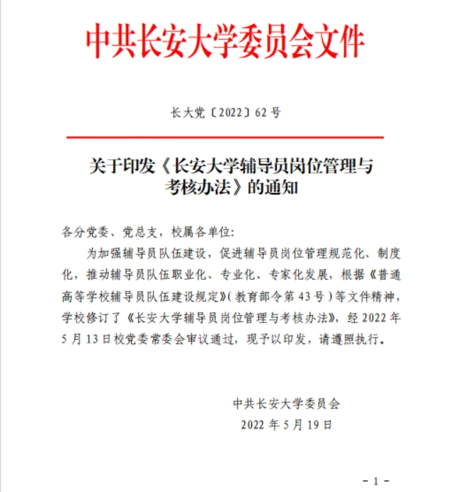 制定《长安大学“一站式”学生社区综合管理模式建设工作方案》,成立由校党委书记、校长任组长的工作领导小组,定期召开“一站式”学生社区建设工作推进会,形成党委统一领导、党政齐抓共管、二级单位各负其责的工作机制;出台《长安大学辅导员管理与考核办法》《长安大学关于进一步加强和改进学生社区教育管理服务工作的实施意见》《长安大学学生“思政班主任”选聘管理办法》《长安大学本科生学业导师选聘管理办法》等一系列文件强化体系支撑,提升综合保障能力。特别是,把辅导员在学生社区开展工作作为辅导员考核的重要指标。