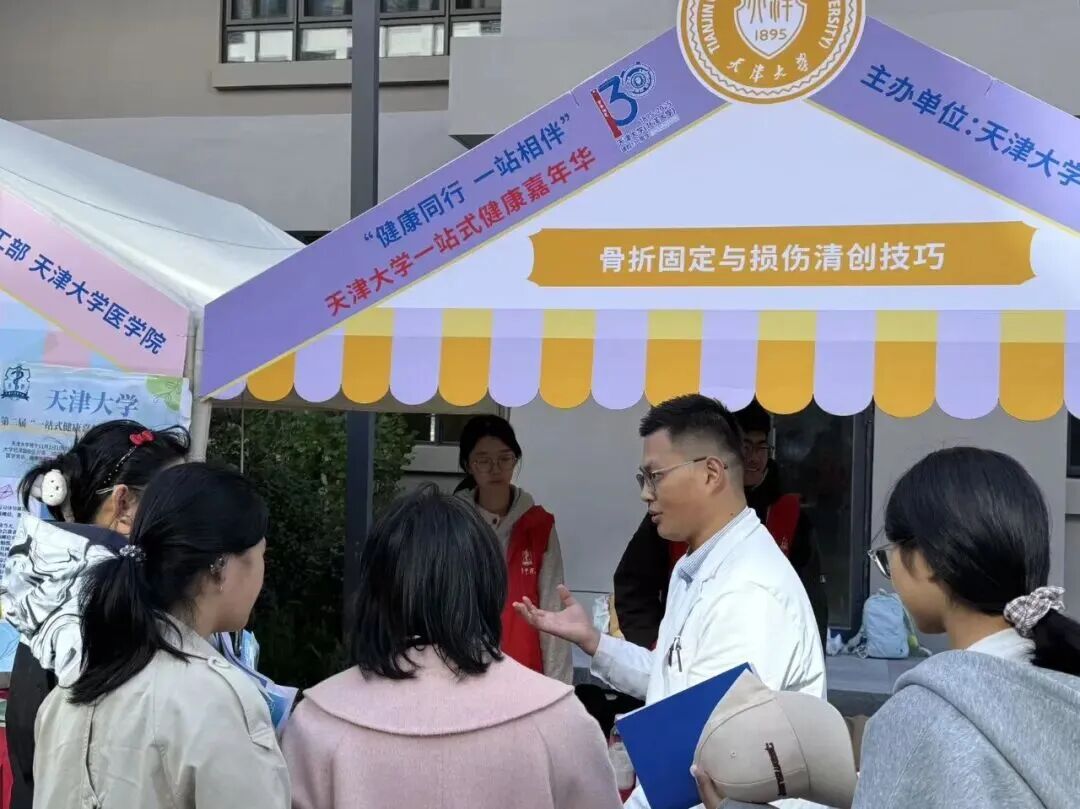 为强化天津大学师生的健康管理意识,普及科学健康知识与急救技能,营造积极向上的校园健康环境,2025年11月1日,天津大学医学院联合党委学生工作部,于北洋园校区举办“天津大学第二届一站式嘉年华”活动。活动涵盖体格检查、饮食健康与慢性病防治、骨折固定与损伤清创技巧、“医”起反诈护平安、传染病防治常识等内容,形式丰富多样,吸引了大批师生参与体验。