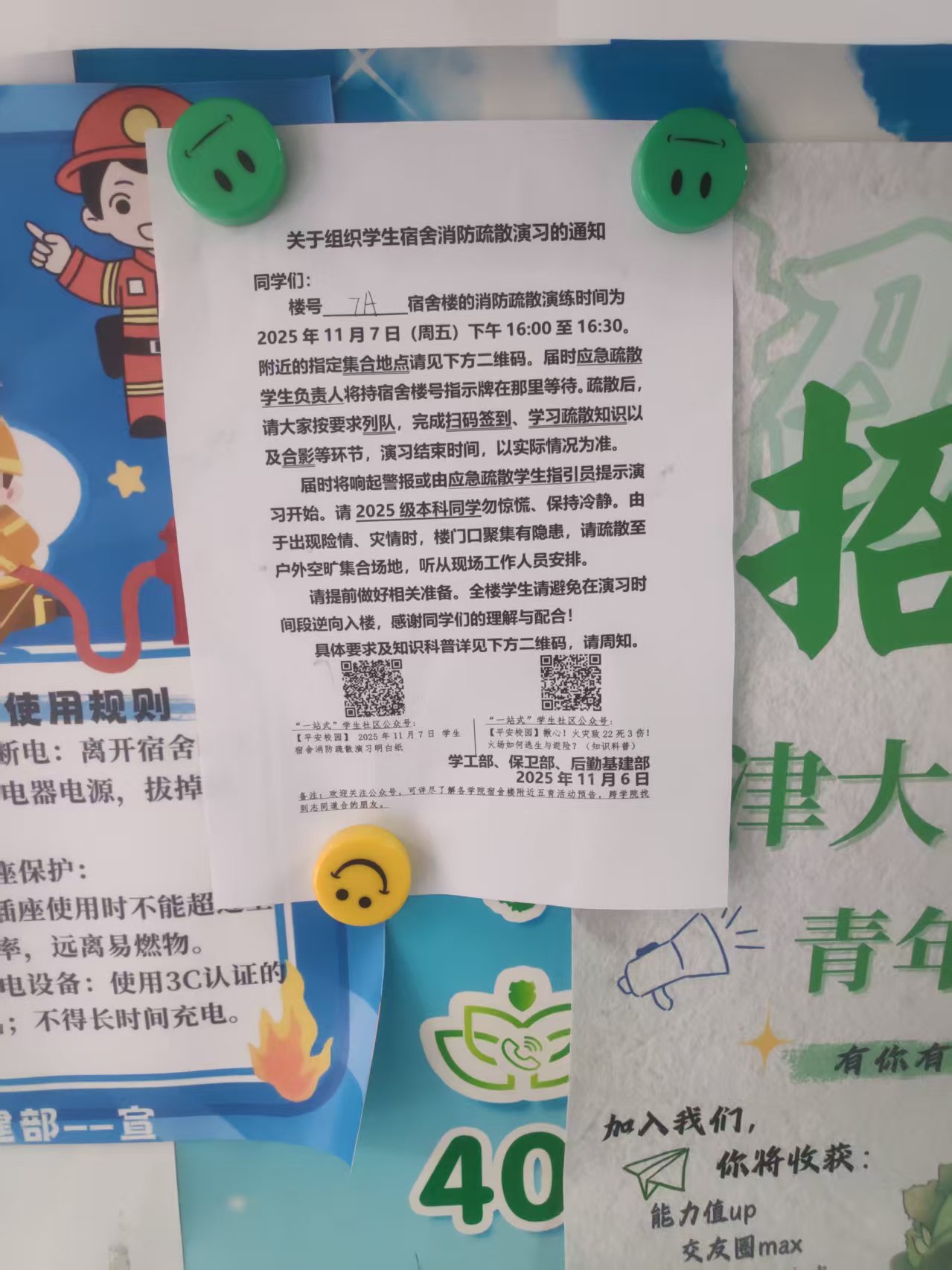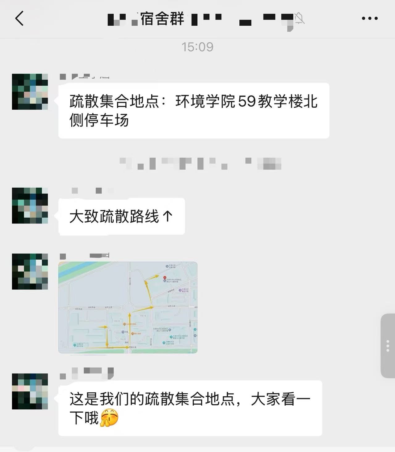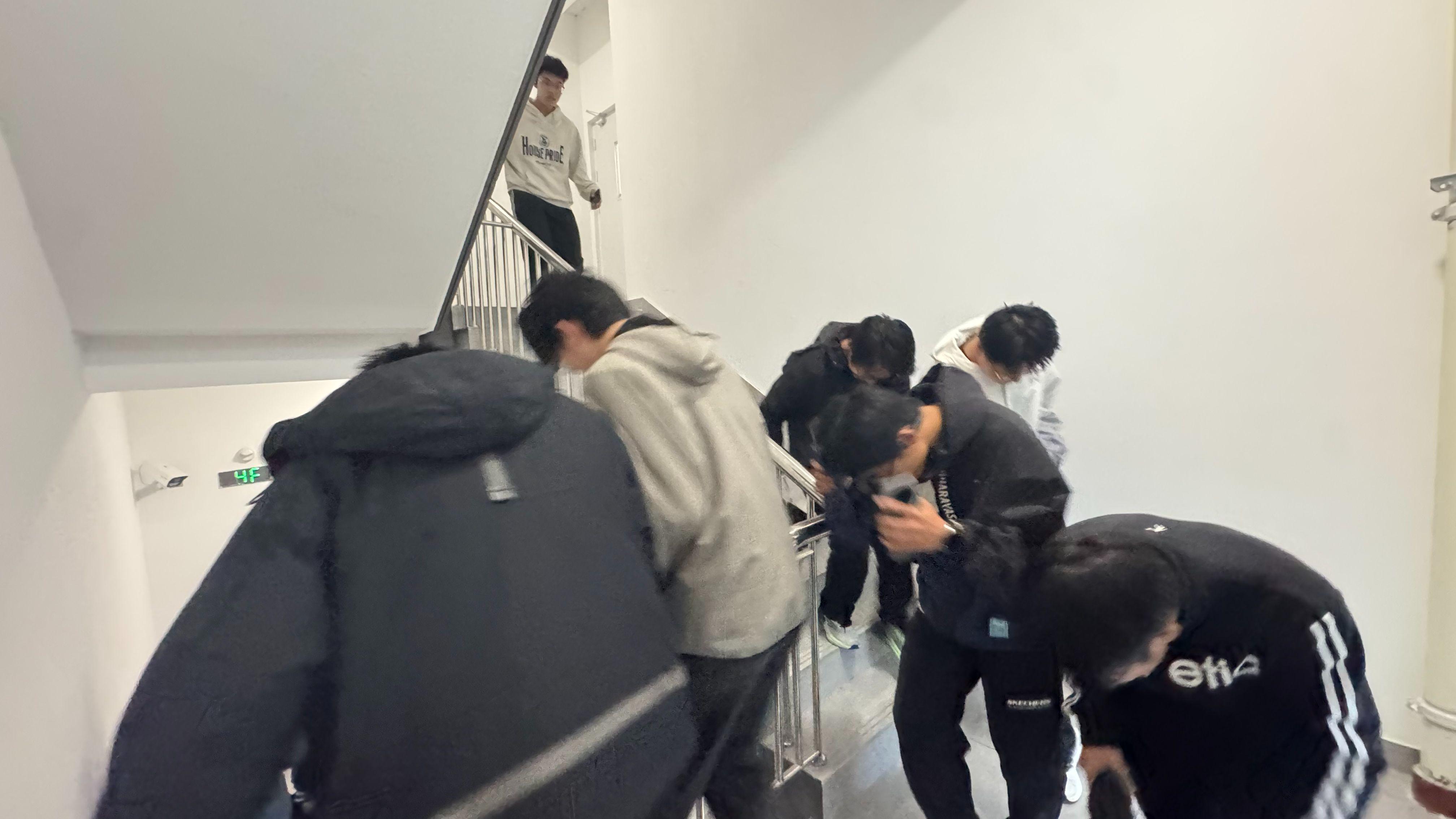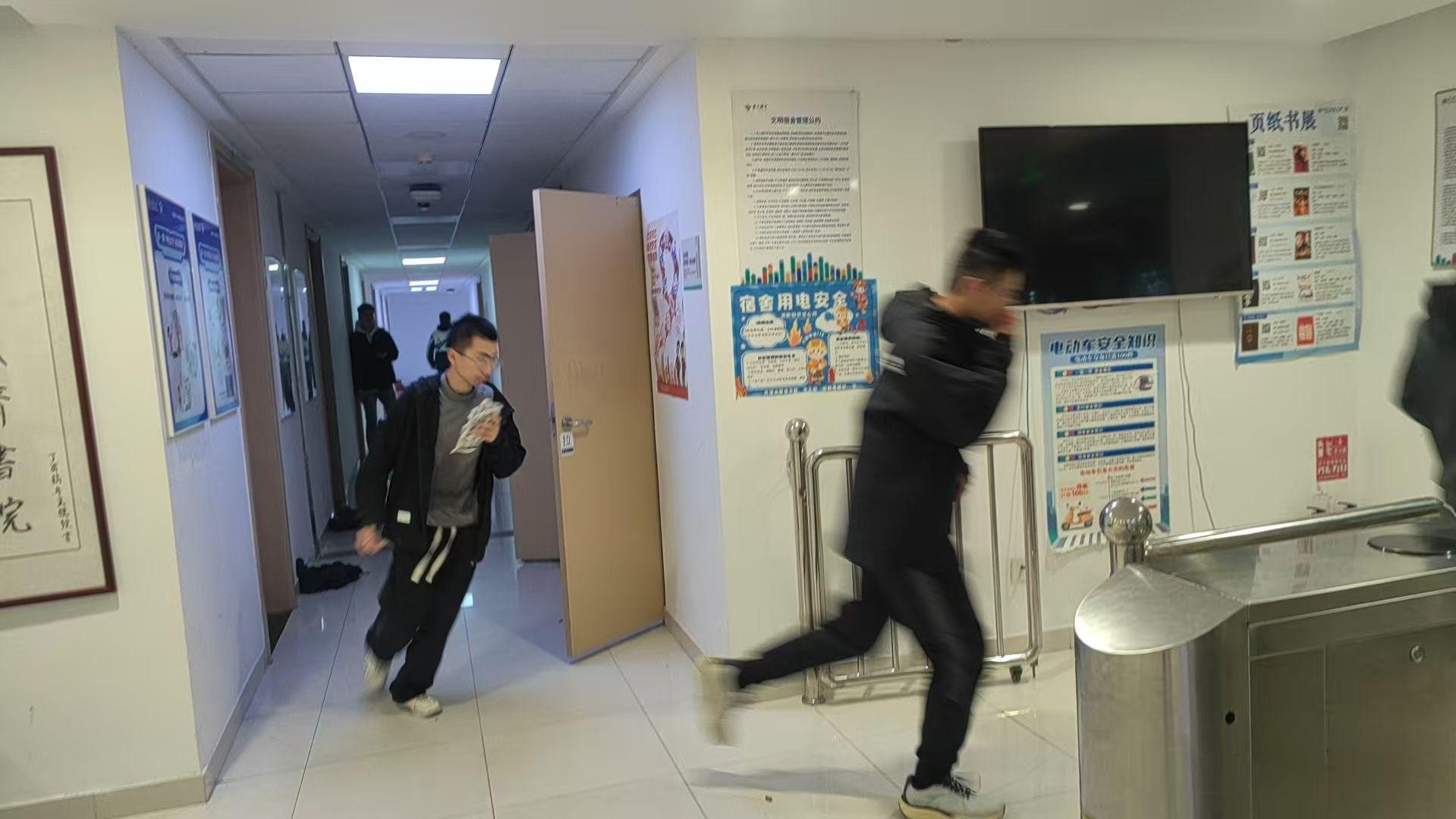 各宿舍楼应急疏散负责团队主动检查走廊、楼梯及各应急出口是否堆积杂物,在宿舍群内发布疏散通知,用喊话器提前录制疏散提示,有的学生负责人更是做到细致入微,告知需跑出宿舍一段距离,以防通道堵塞。