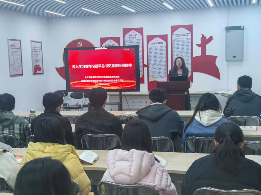 为深入贯彻落实党的二十大和二十届四中全会精神,深入学习宣传贯彻习近平总书记重要回信精神,12月5日,化工学院本科生学生社区领军卓越党支部与合成生物与生物制造学院本科生合成生物学党支部于诚园7B“一站式”学生社区党员活动中心开展联学共建。学生社区领军卓越党支部书记张新宇主持会议,双方支部党员共同参与学习研讨。