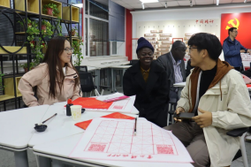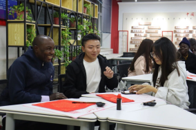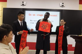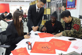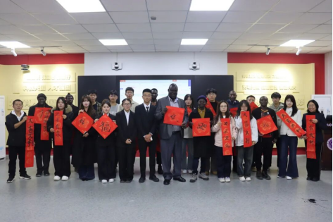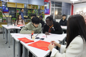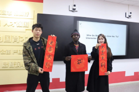 活动伊始,学校中非交流社团的学生讲解了春联与“福”字的文化内涵。从“福”字承载的美好生活向往,到春联对仗工整的语言艺术,再到笔墨运用的基本技巧,细致的讲解搭配生动演示,带领乌干达师生领略笔走龙蛇的书法乐趣。