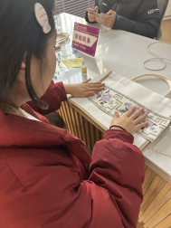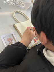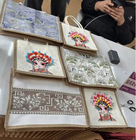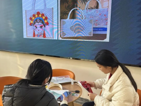 活动设置了三个富有特色的非遗手作体验项目。在“戏曲凤冠帆布包”环节,师生将京剧戏曲头面中的凤冠元素与现代帆布包结合,通过粘贴脸谱、点缀颜料,创作出兼具美观与实用性的作品;“点翠凤冠”环节中,参与者以仿羽毛、铜片等材料亲手制作饰品,感受这项源于汉代、盛于明清的国家级非遗工艺的精湛与雅致;“国风宋锦帆布包”则以宋代织锦为灵感,引导师生在帆布包上绣制传统纹样,体会宋锦作为人类非物质文化遗产的典雅与深厚。活动现场气氛热烈,师生在手工制作中沉浸体验,交流创作心得,不仅感受到动手的乐趣,也更深入地理解了非遗文化在当代的传承脉络。
