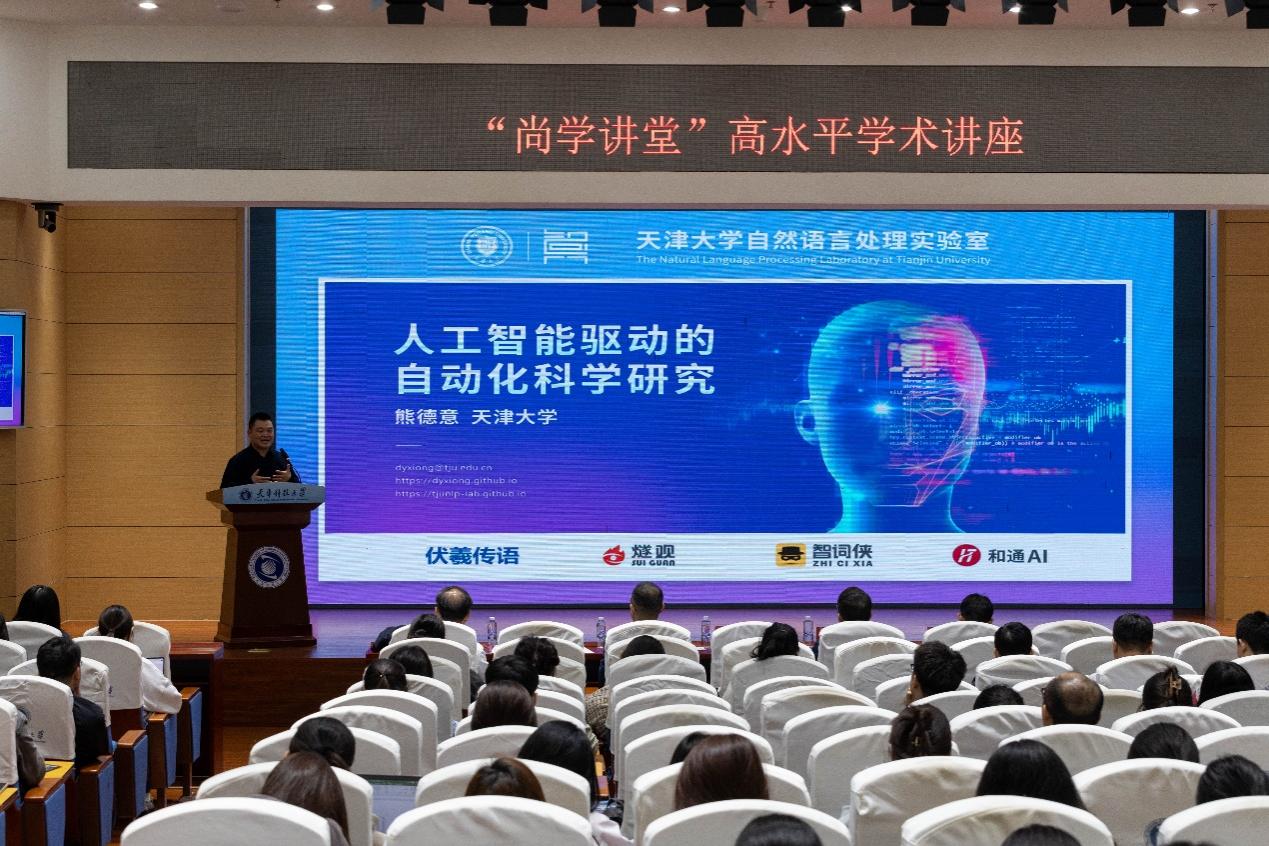 10月15日,天津科技大学“尚学讲堂”高水平学术讲座在滨海中校区逸夫楼报告厅举行。报告会以“AI+科研”为主题,邀请天津大学智能与计算学院熊德意教授、天津科技大学食品科学与工程学院夏小乐教授、天津科技大学生物工程学院刘夫锋教授作学术报告。科技处、食品科学与工程学院、生物工程学院等单位的200余名师生参加报告会。科技处副处长司传领出席报告会并致辞,食品科学与工程学院副院长刘继锋主持报告会。