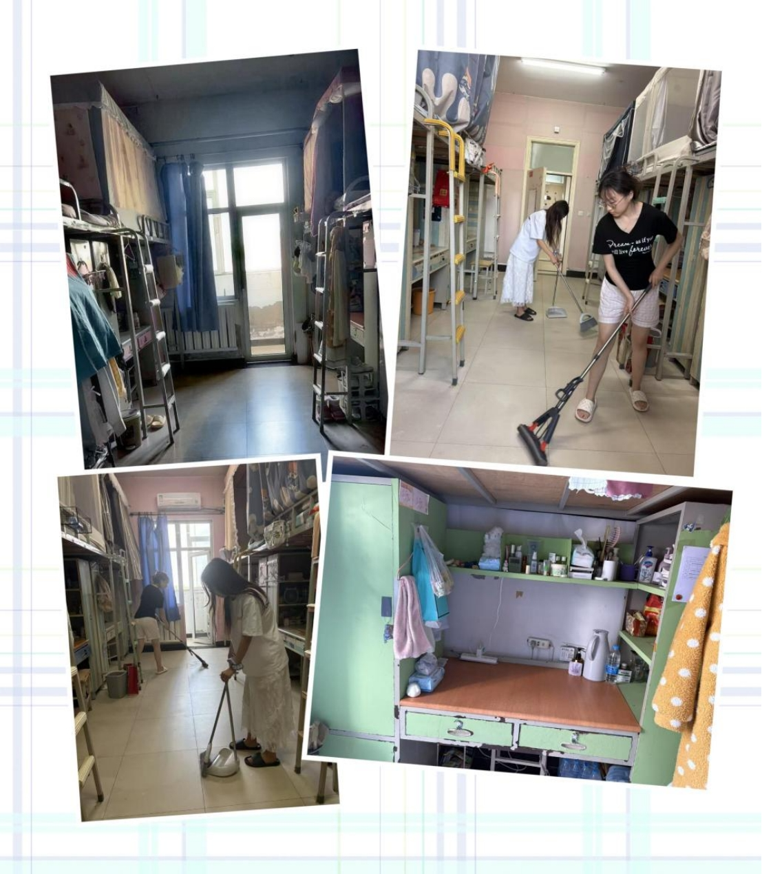 同学们利用假期对宿舍展开全面清扫:地面、桌面、个人物品彻底清理,公共区域不留死角,通过物品分类整理,打造整洁有序的储物空间,营造舒适宜人的居住空间。