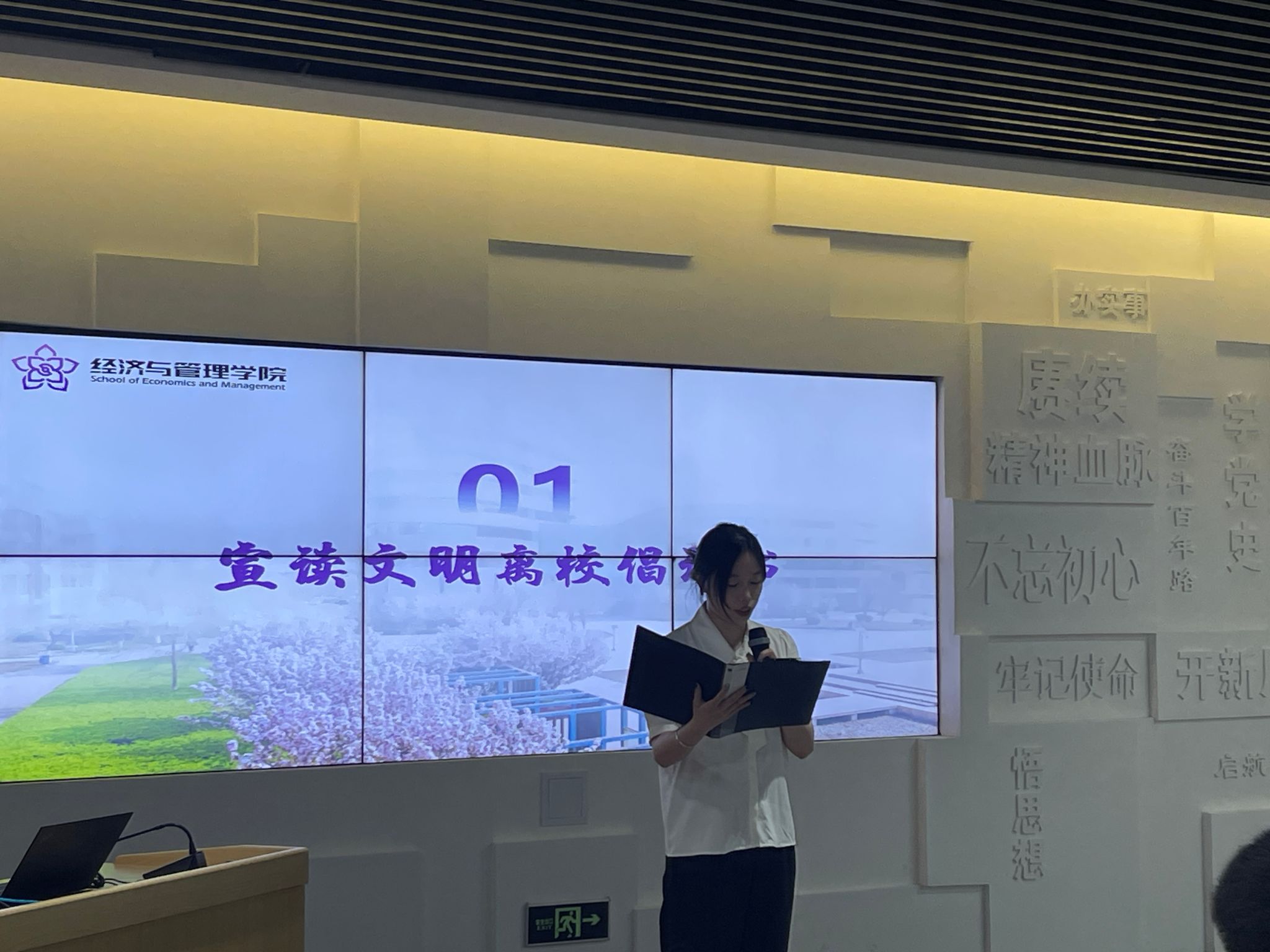 毕业班党员林思琦同学宣读文明离校倡议书,号召毕业生要遵规守纪、牢记师恩、文明有序离校。学生党员代表于桐豪、徐婧怡、王克典、周春梅和林思琦依次发言表态,他们感谢母校培养之情,并表示将以此为起点,不断学习、不断进步、不断超越自我,为实现人生价值而努力奋斗。