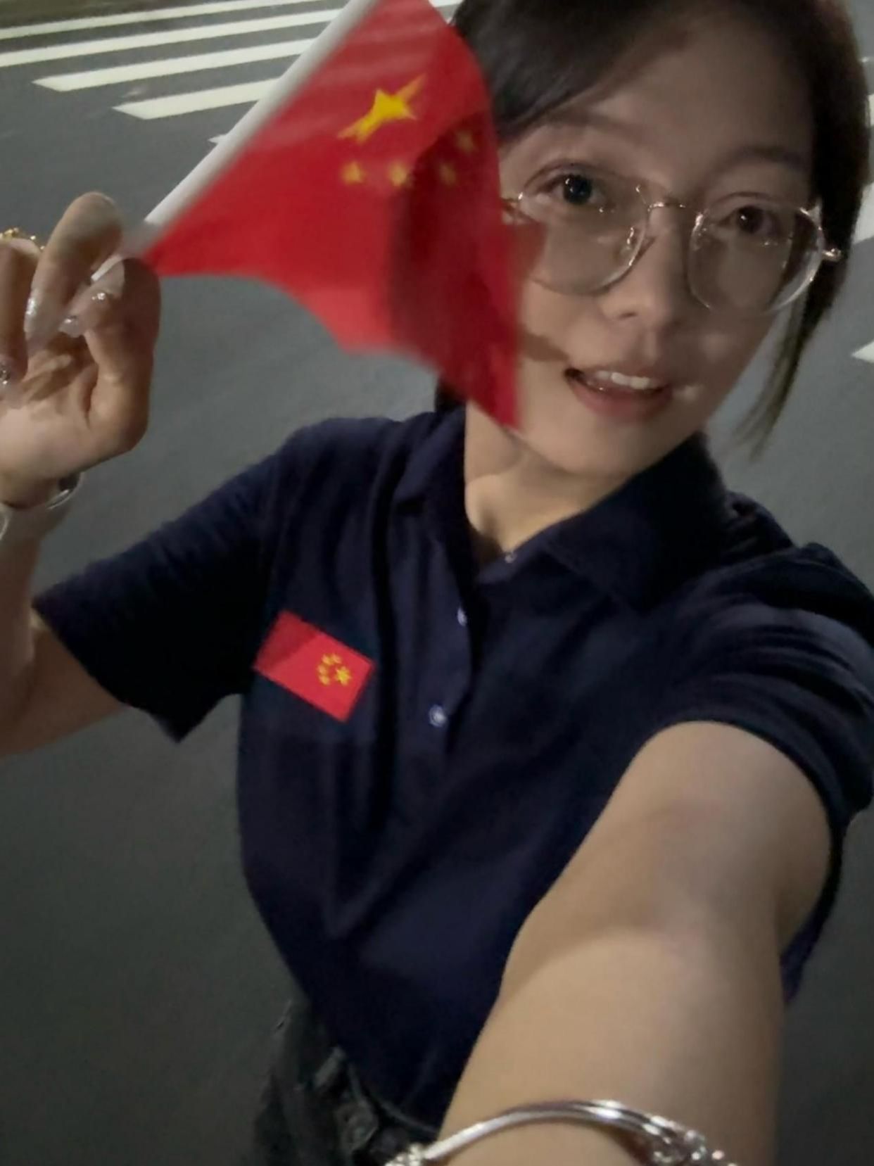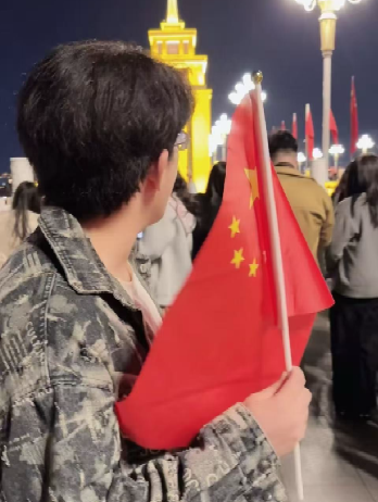 在城市夜景中,24级给排水科学与工程专业王帅同学手持国旗,背景的建筑在灯光下熠熠生辉,她以真挚的笑容与城市夜景同框,在繁华都市里传递对祖国的赤诚热爱。