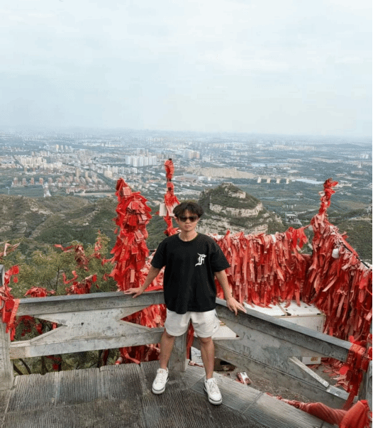 在山顶观景台,23级土木工程专业牛雨童同学立于布满红色祈福带的平台上,背后是城市与山峦交织的壮丽画卷,他以昂扬姿态与祖国大好河山同框,在登高望远中感受祖国大地的辽阔,将对祖国的热爱寄情于山河