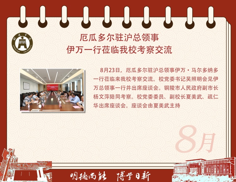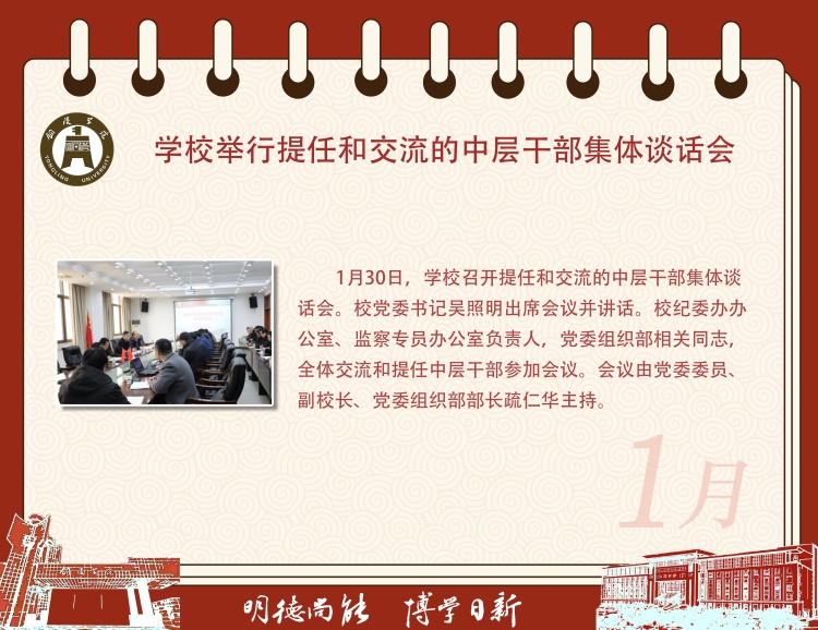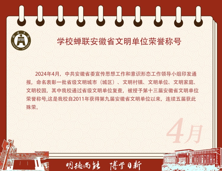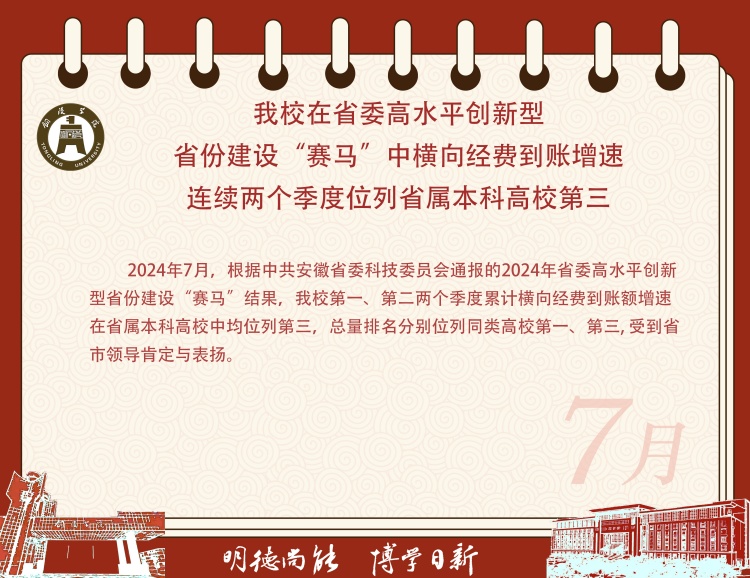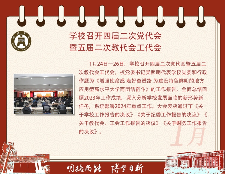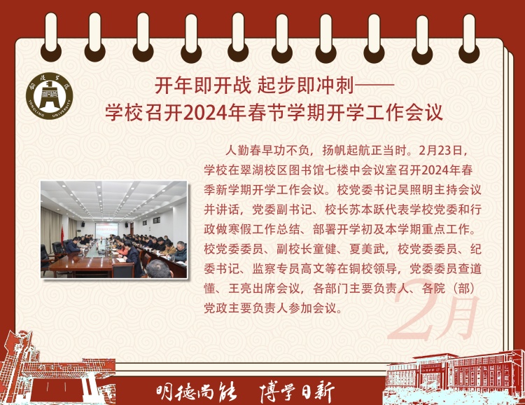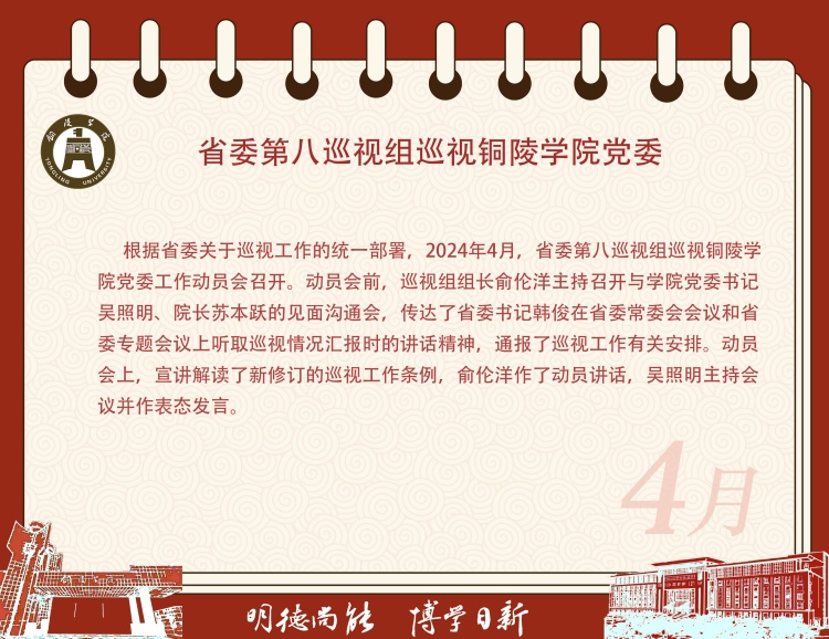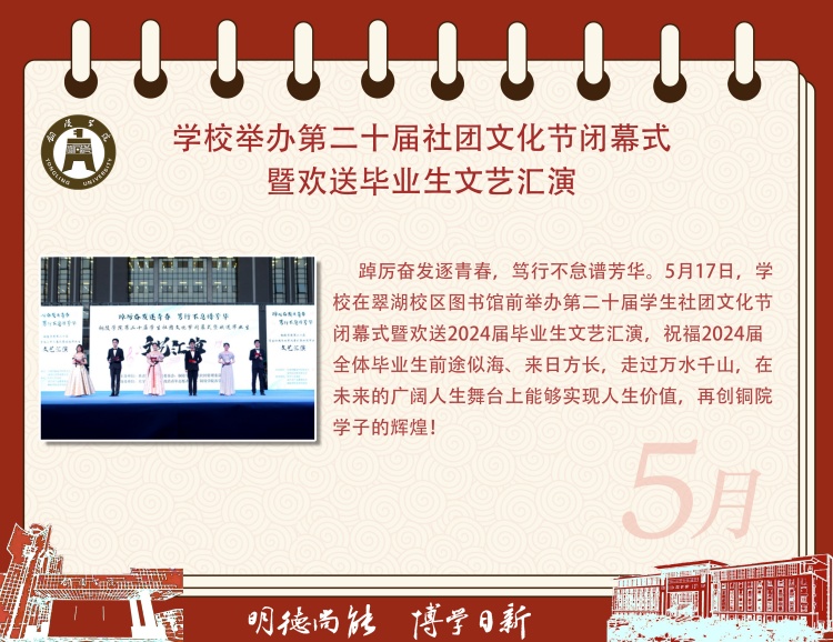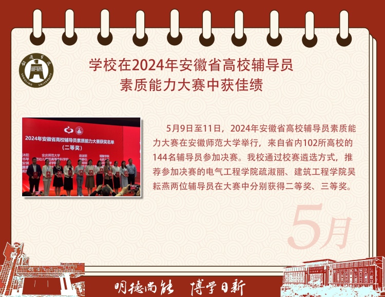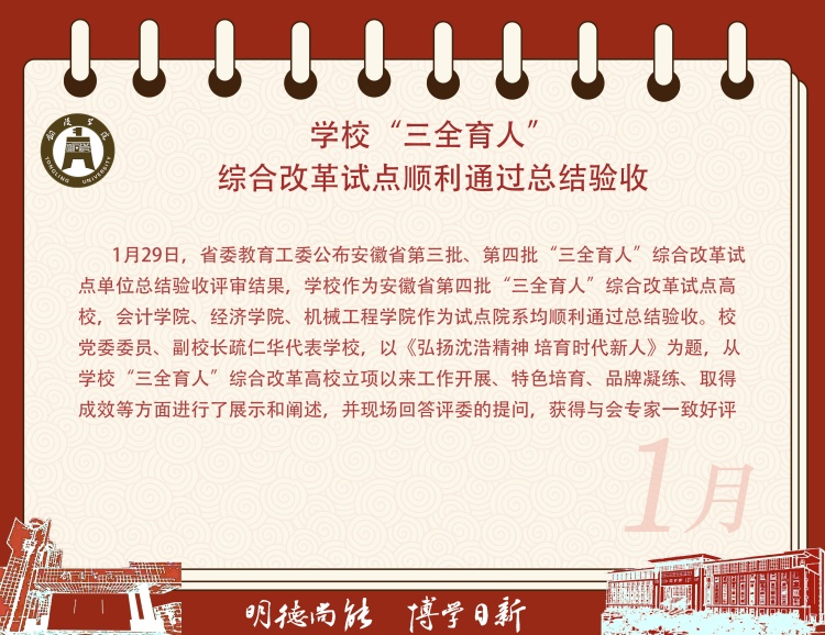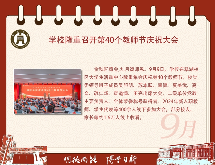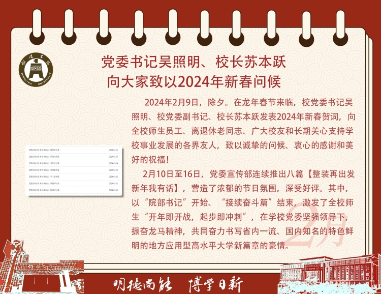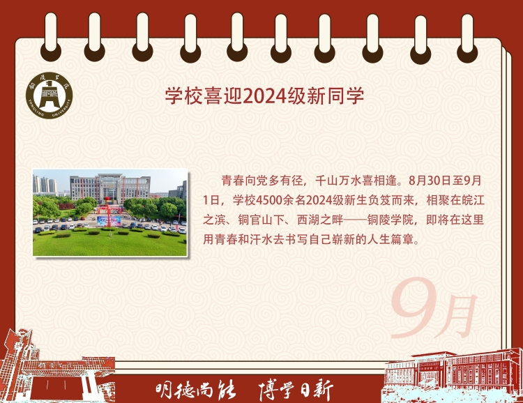 编者按 2024年,铜陵学院深入学习贯彻党的二十大和二十届三中全会精神、全国教育大会精神、习近平总书记考察安徽重要讲话精神,扎实开展党纪学习教育,党建工作取得新成效、立德树人取得新收获、人才工作取得新进展、科学研究取得新突破、社会服务开创新局面、特色办学迈上新台阶。这一年,全体铜院人团结奋斗、踔厉奋发,坚持不懈用习近平新时代中国特色社会主义思想凝心铸魂,奋力朝着地方应用型高水平大学建设目标加速迈进!为回顾总结铜院人这一年的奋斗历程,特推出一年重点新闻盘点,以此激励全体铜院人牢记嘱托、感恩奋进,在以中国式现代化全面推进中华民族伟大复兴的征程中,奋力谱写铜陵学院高质量发展新篇章。