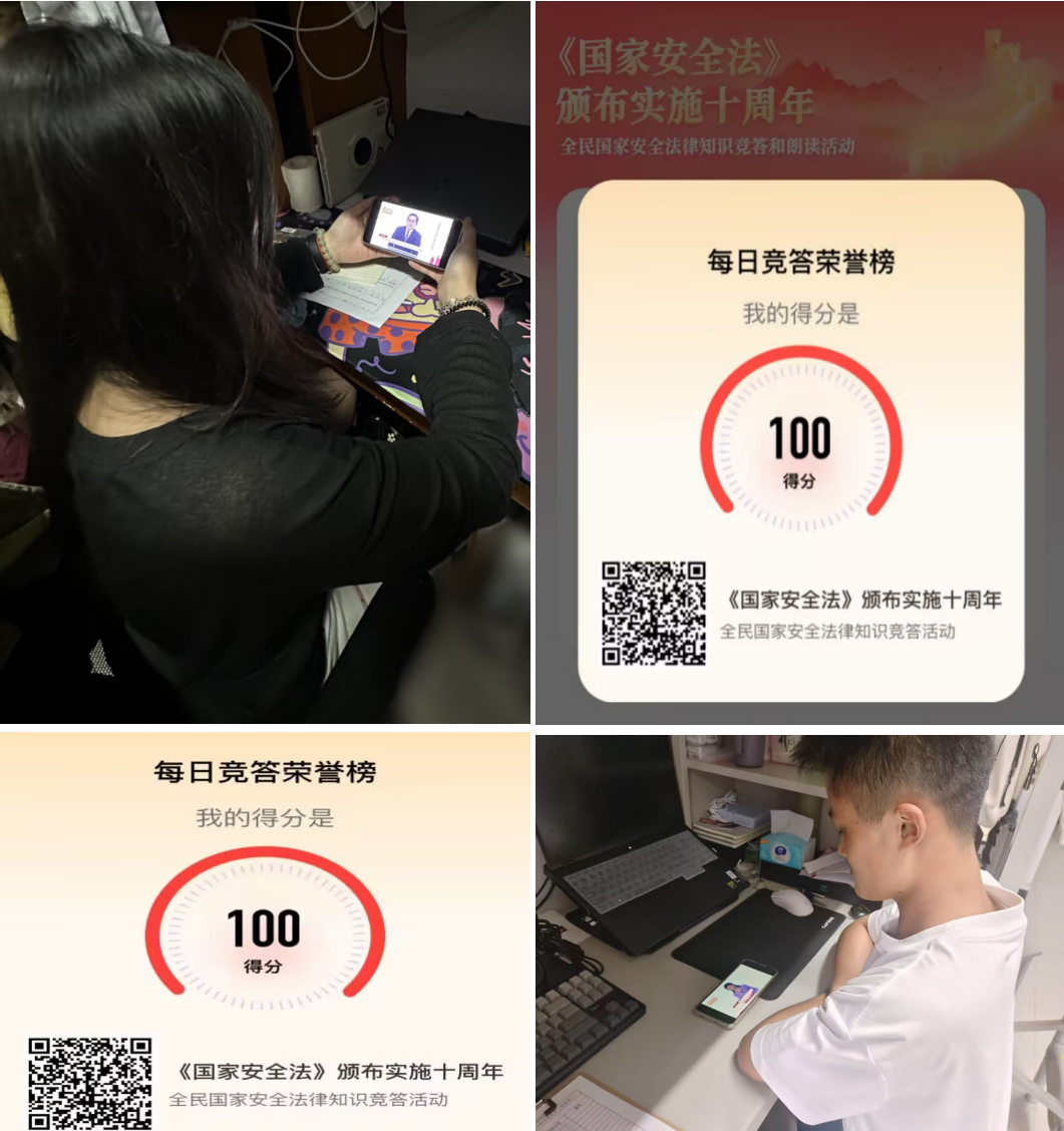 各班级积极组织学生参加国家安全知识竞答活动。题库涵盖《中华人民共和国国家安全法》《中华人民共和国反间谍法》等法律法规,吸引数千名学生参与。在激烈的竞赛氛围中,同学们进一步巩固国家安全知识,提升法律素养。
