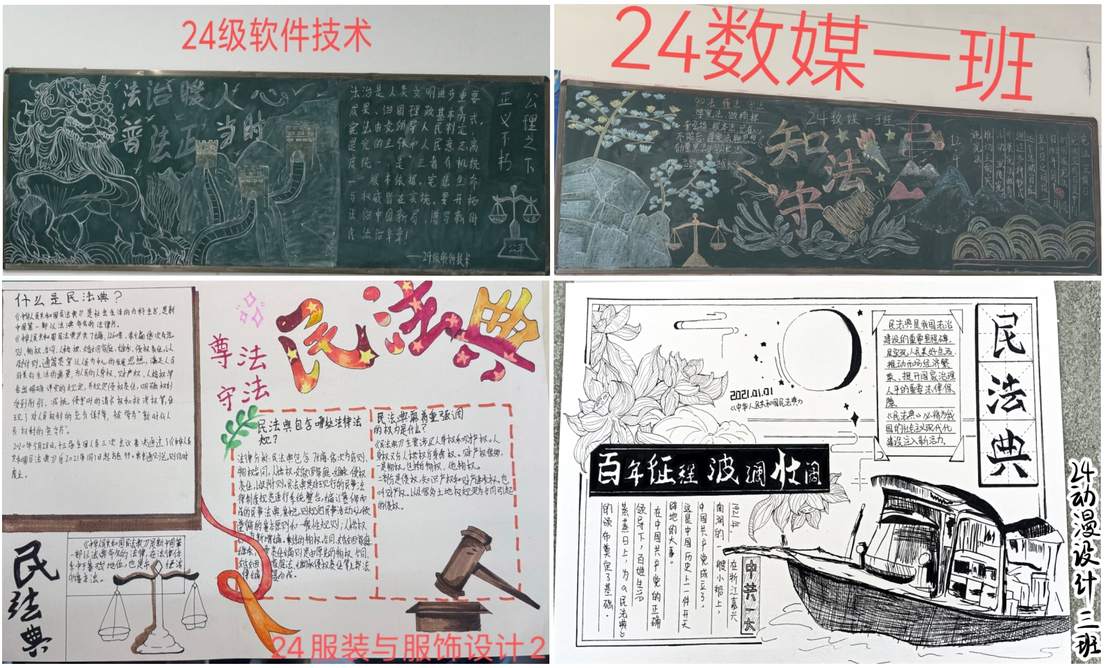 宣传月期间,各班积极参与民法典主题黑板报和手抄报制作活动。同学们精心设计版面,用绚丽的色彩、工整的文字和精美的插图,将民法典的主要内容、亮点特色和重要意义呈现在黑板和画纸上。一幅幅主题鲜明、内容丰富的黑板报和手抄报,不仅展示了同学们的艺术才华,还在系部内营造了浓厚的民法典学习氛围,成为一道亮丽的法治文化风景线。