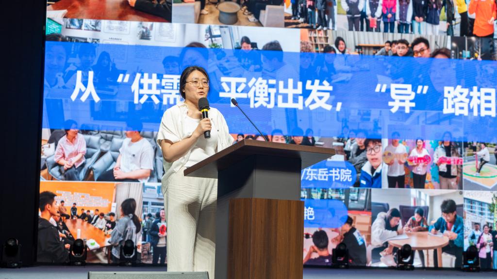 在“一边给予一边留住”的实践智慧环节,来自电影评论中心,汶阳书院/淬炼商学院全生异科导师冯雯艳与学生工作处,东岳书院/大数据学院全生异科导师刘俊艳先后登台分享“师生同行”经验。冯雯艳以《是“一”不是“异”》为题,倡导真正的教育不是放大师生差异的“异”,而是聚焦共同成长目标的“一”。她以与学生陪伴成长为例:通过将大咖传记阅读转化为影视片段,降低认知门槛,激发学生共鸣;在就业指导中,以京东offer选择案例展示如何将“我要求你”转为“我们一起分析”,引导学生理性决策。她强调“同行”的本质是建立共同目标、理解与信任,让差异成为丰富旅程的风景。