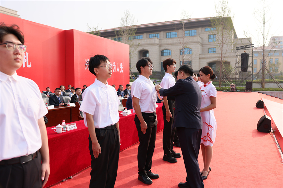 典礼上,校党委书记沈兴全为2025级新生代表郑重佩戴太原理工大学校徽,全体新同学自行佩戴校徽。校徽是学校的文化缩影,是师生身份认同与精神凝聚的象征。太原理工大学校徽见证了学校123年的风雨历程和辉煌成就,凝聚了一代代理工人的赤子情怀和庄严责任。戴上校徽的这一刻,全体新同学正式成为了太原理工大学的一员。