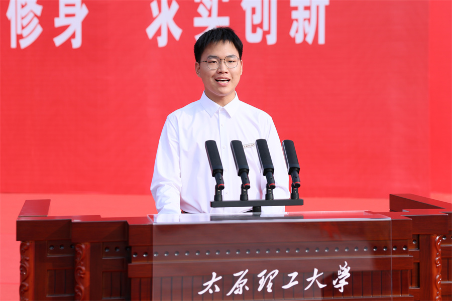 求实学院光电信息科学与工程2502班赵浩哲同学代表新生发言。他表示,作为一名太理人,“求实 创新”的校训将融入我们的血液,“陪太理、拼到底”将成为我们新的人生底色!他号召同学们,作为新时代的青年,要深耕细研,涵养“探求真知”的专注;要胸怀家国,树立“矢志报国”的志向;要勇毅前行,锤炼“不惧挑战”的品格,四年之后,成长为心中有火、眼中有光的太理人,共同书写无愧于时代青春华章。