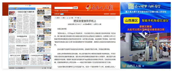 大会期间,该项目还引起了《山西工人报》的特别关注,团队成员张校亮教授、孟雪娟副教授现场分别接受了采访,就李晓春教授团队的匠心历程、仪器的技术特点、应用领域等进行了详细介绍。该仪器利用智能手机平台,结合光学检测与无线通讯技术,可实现目标物的现场快速、低成本检测。该仪器轻巧、便携、不仅能用于食品安全检测领域,还能用于医疗诊断、环境监测等领域,特别适用于基层检测。