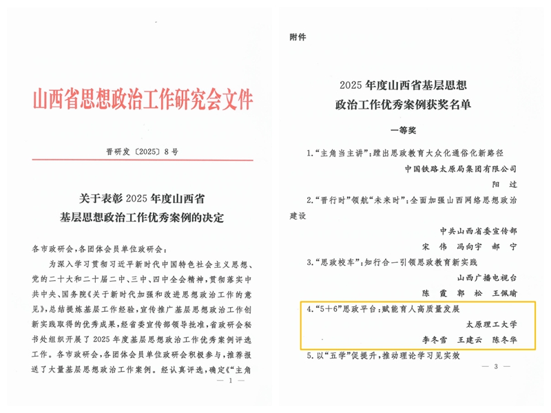 近日,山西省政研会公布2025年度山西省基层思想政治工作优秀案例名单,我校化学与化工学院李冬雪老师牵头申报的《“5+6”思政平台 赋能育人高质量发展》荣获山西省基层思想政治工作优秀案例一等奖。