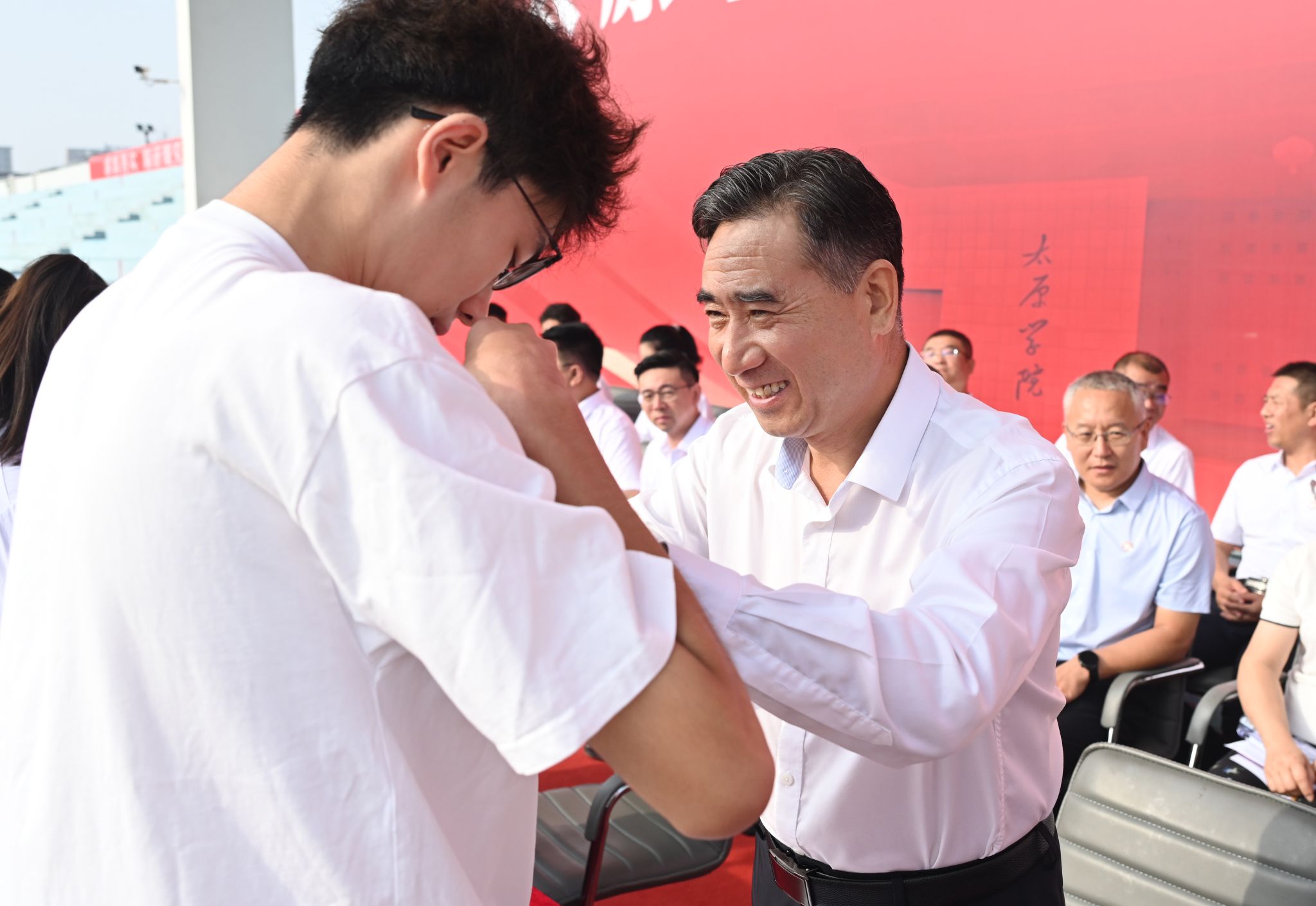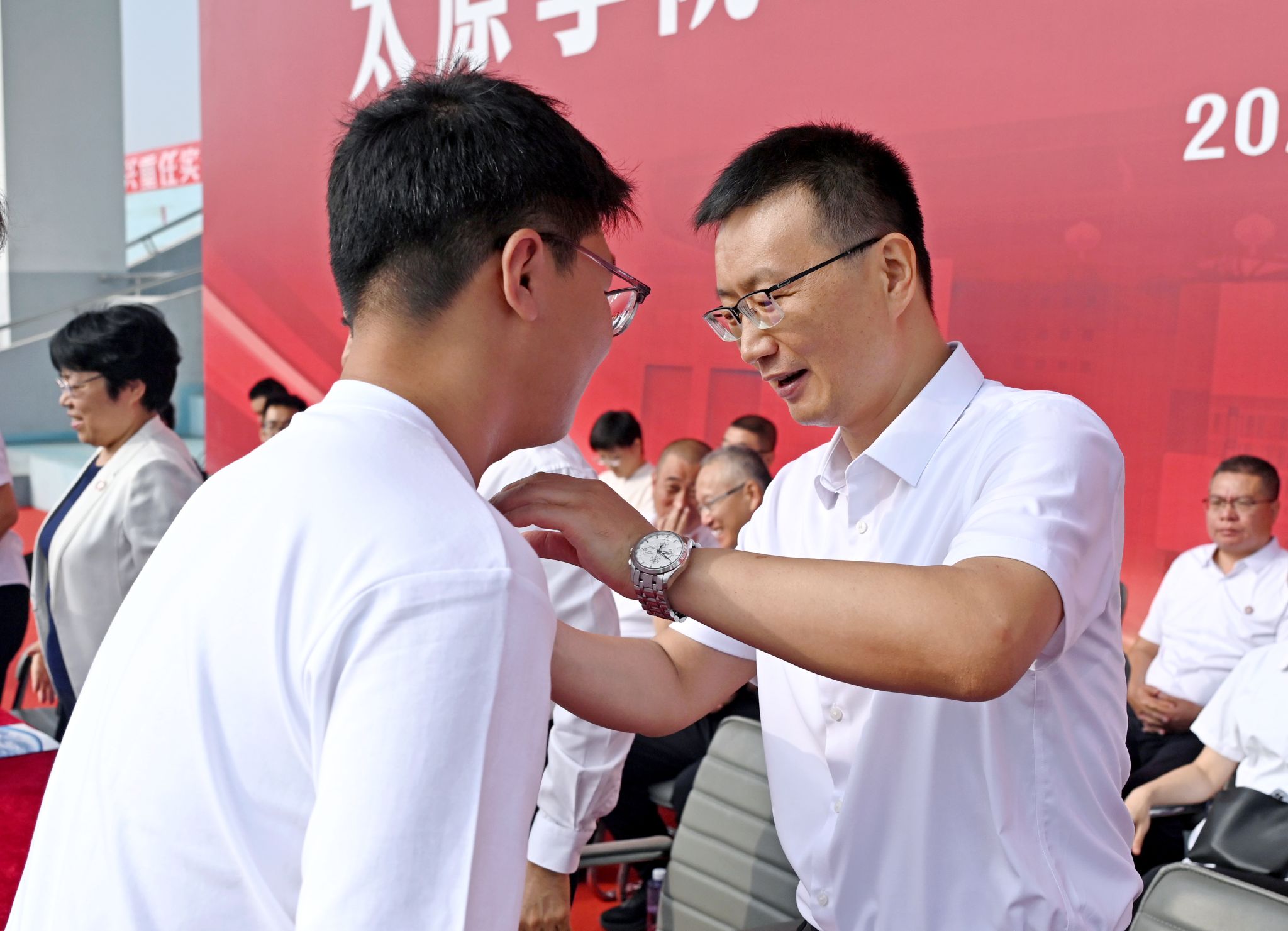 校领导为新生代表佩戴校徽。别在胸前的校徽熠熠闪光,是“太院人”的象征,承载着校训精神,激励着每一位新太院人励志勤学,刻苦磨练,创造新的辉煌。