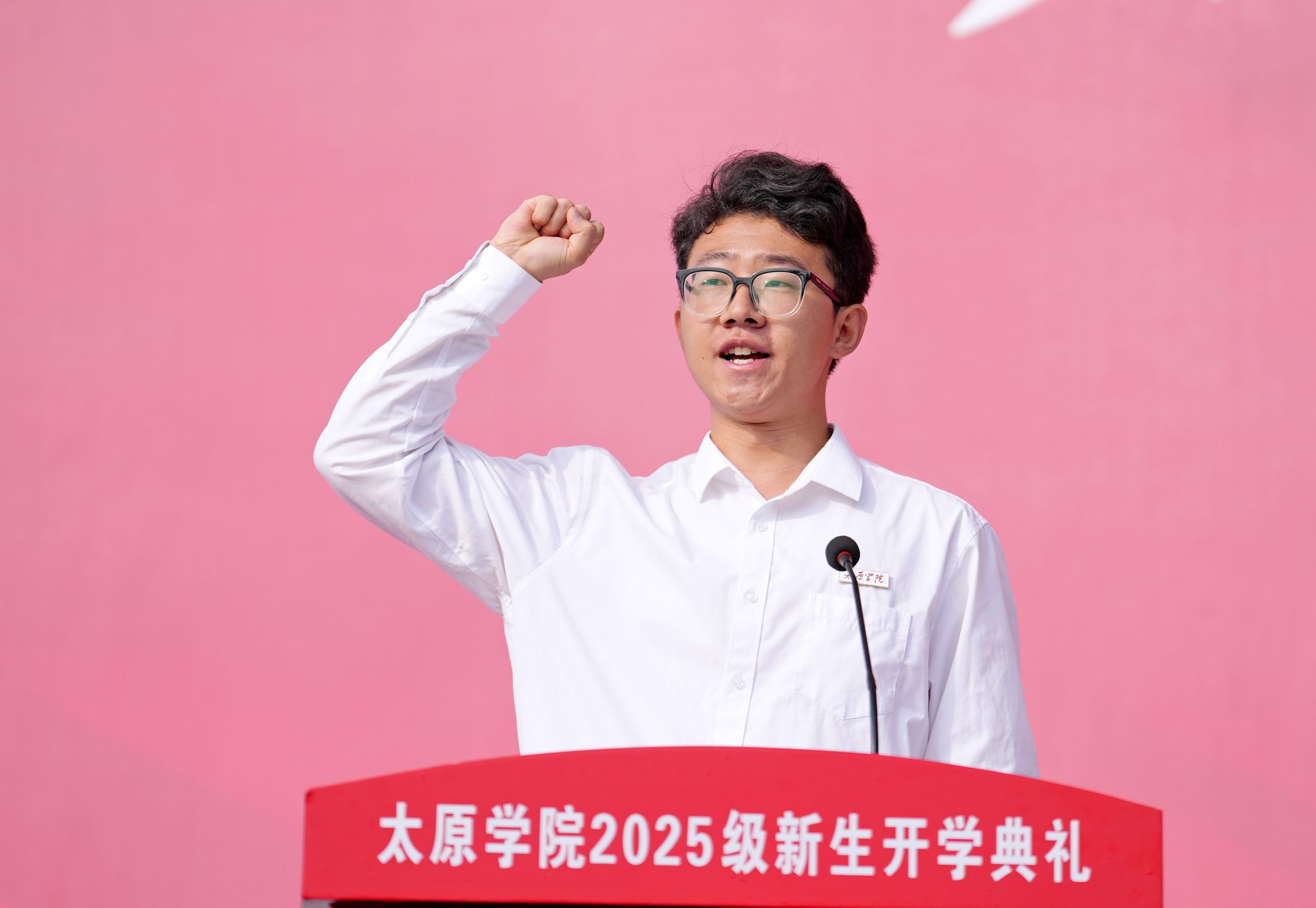 校学生会执行主席、智能与信息工程系物联2203班温元枢同学带领全体新同学庄严宣誓:“胸怀祖国,忠于人民;尊师爱校,明德修身;诚以待人,毅以处事......奋力书写为中国式现代化挺膺担当的青春篇章!”铿锵誓言响彻校园,既是同学们对自己的承诺,更是对未来的宣告。