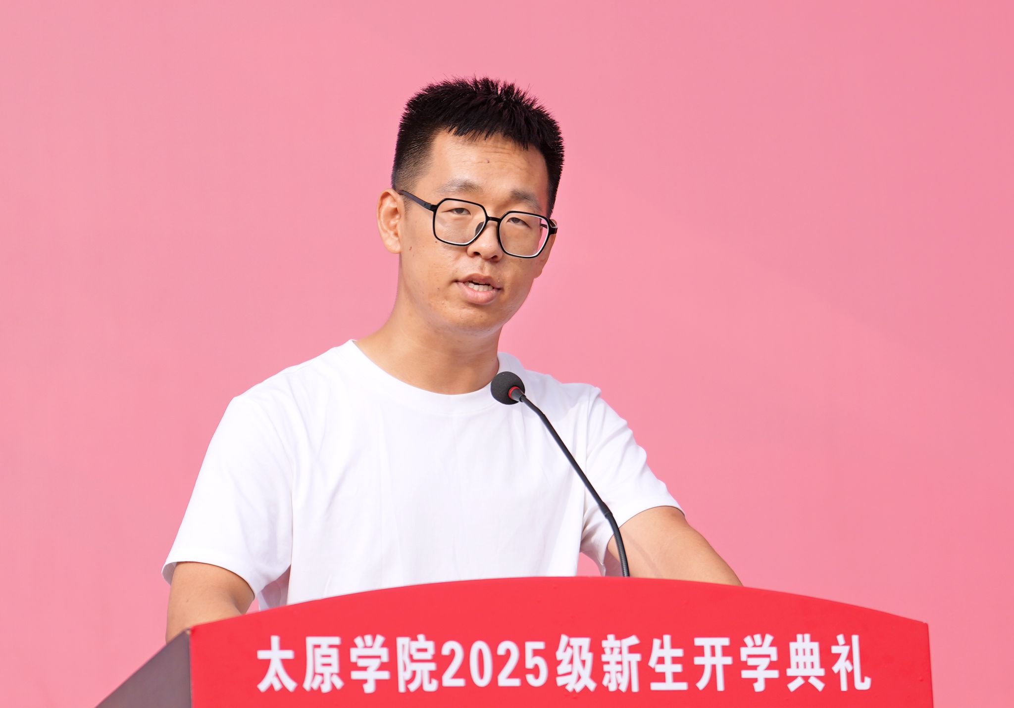 旅游系系主任张煜老师作为教师代表发言,他与同学们分享了扎根、探索、担当三个关键词,希望同学们能以校训为帆、以奋斗为桨,在太原学院这片沃土上,不负韶华、不负时代,让“博学、弘毅、力行、至善”的种子生根发芽,成长为照亮未来的参天大树。