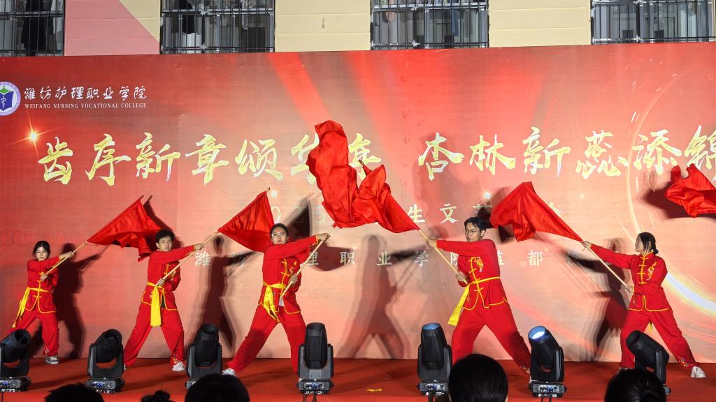 晚会在乐队的超燃节奏中震撼开场。12个自编自演节目轮番登台,歌舞《一起向未来》以跃动旋律展现潍护学子昂扬风貌。教师代表深情献唱《我爱你中国》,引爆全场爱国热情。小品《体检警告》用幽默桥段传递健康科普。朗诵《八秩荣光 青春誓言》铿锵有力,许下青春报国志。古风舞蹈《三拜红尘凉》尽显传统文化之美。合唱《如愿》唱出对先辈的敬意与对未来的希冀。拉丁舞、爵士舞用动感节奏诠释青春自信。压轴节目《美丽中国》舞狮腾跃,以歌声与鼓点共绘山河锦绣,为晚上画上圆满句号。